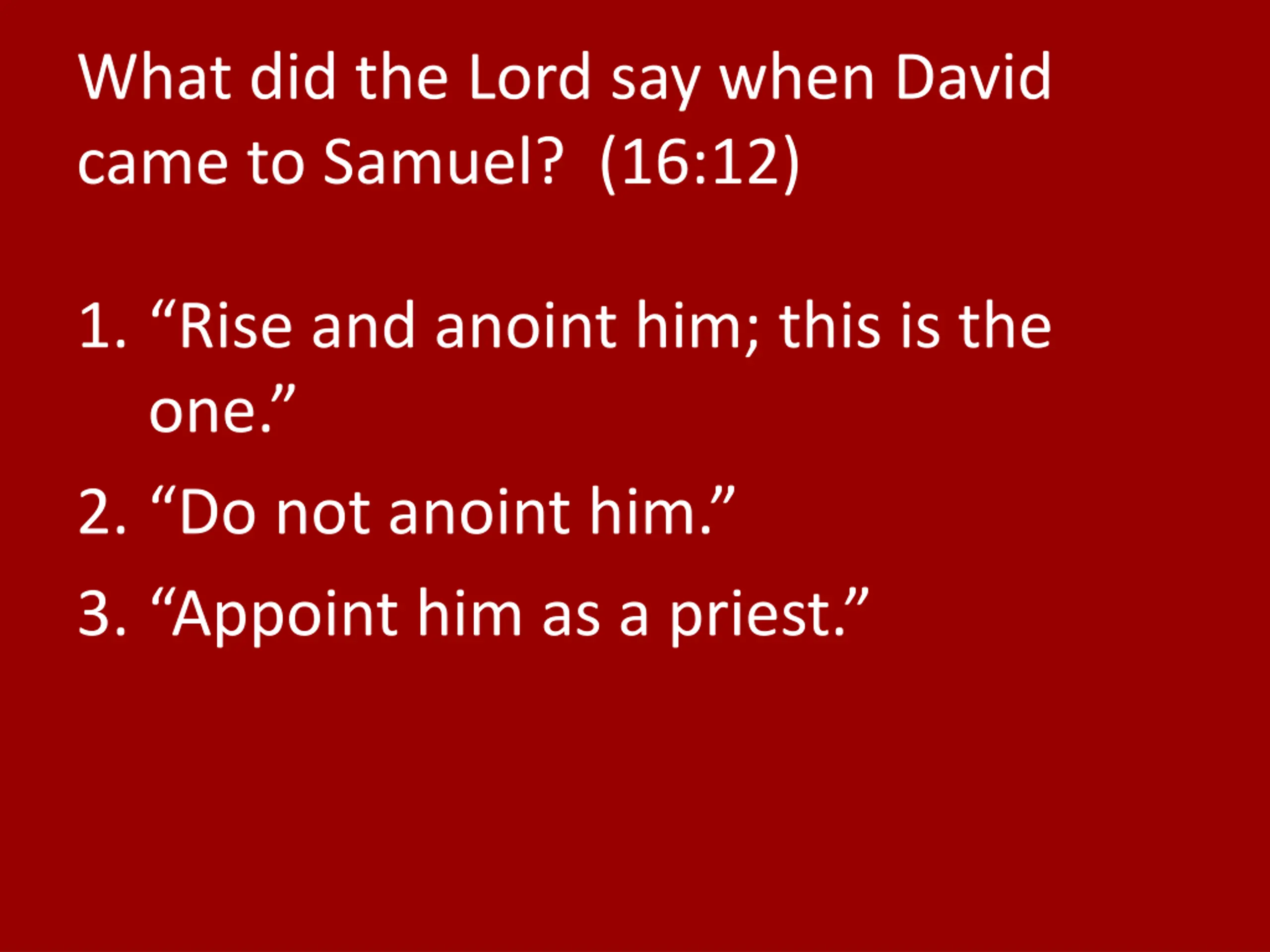What did the Lord say when David came to Samuel? (16:12) 1. Rise and anoint him; this is the one. 2. Do not anoint him. 3. Appoint him as a priest.