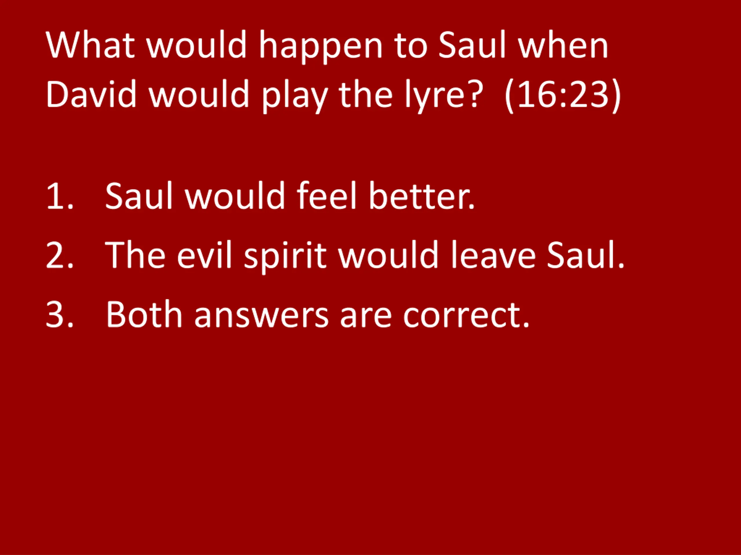 What would happen to Saul when David would play the lyre? (16:23) 1. Saul would feel better. 2. The evil spirit would leave Saul. 3. Both answers are correct.