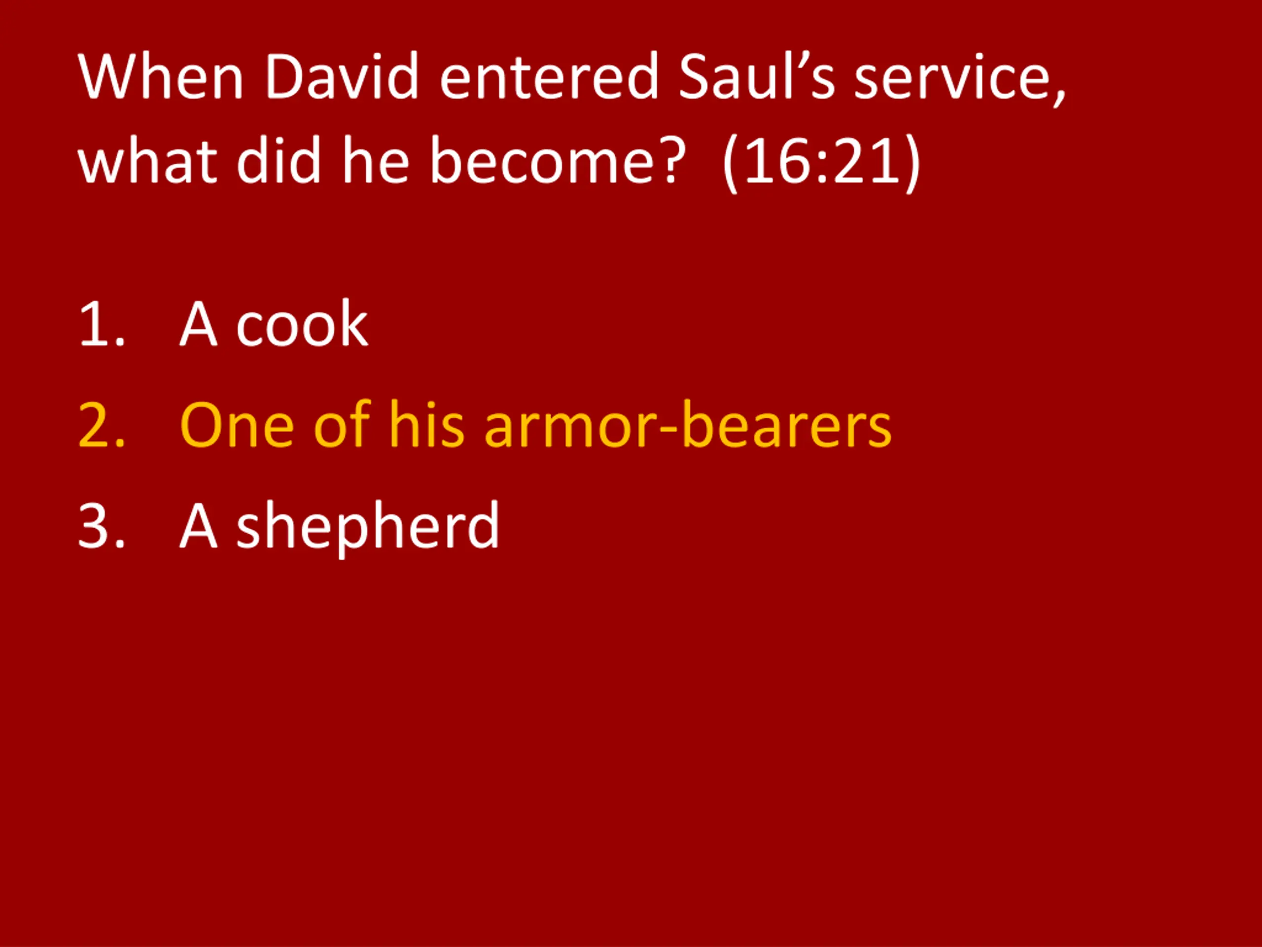 When David entered Sauls service, what did he become? (16:21) 1. A cook 2. One of his armor-bearers 3. A shepherd