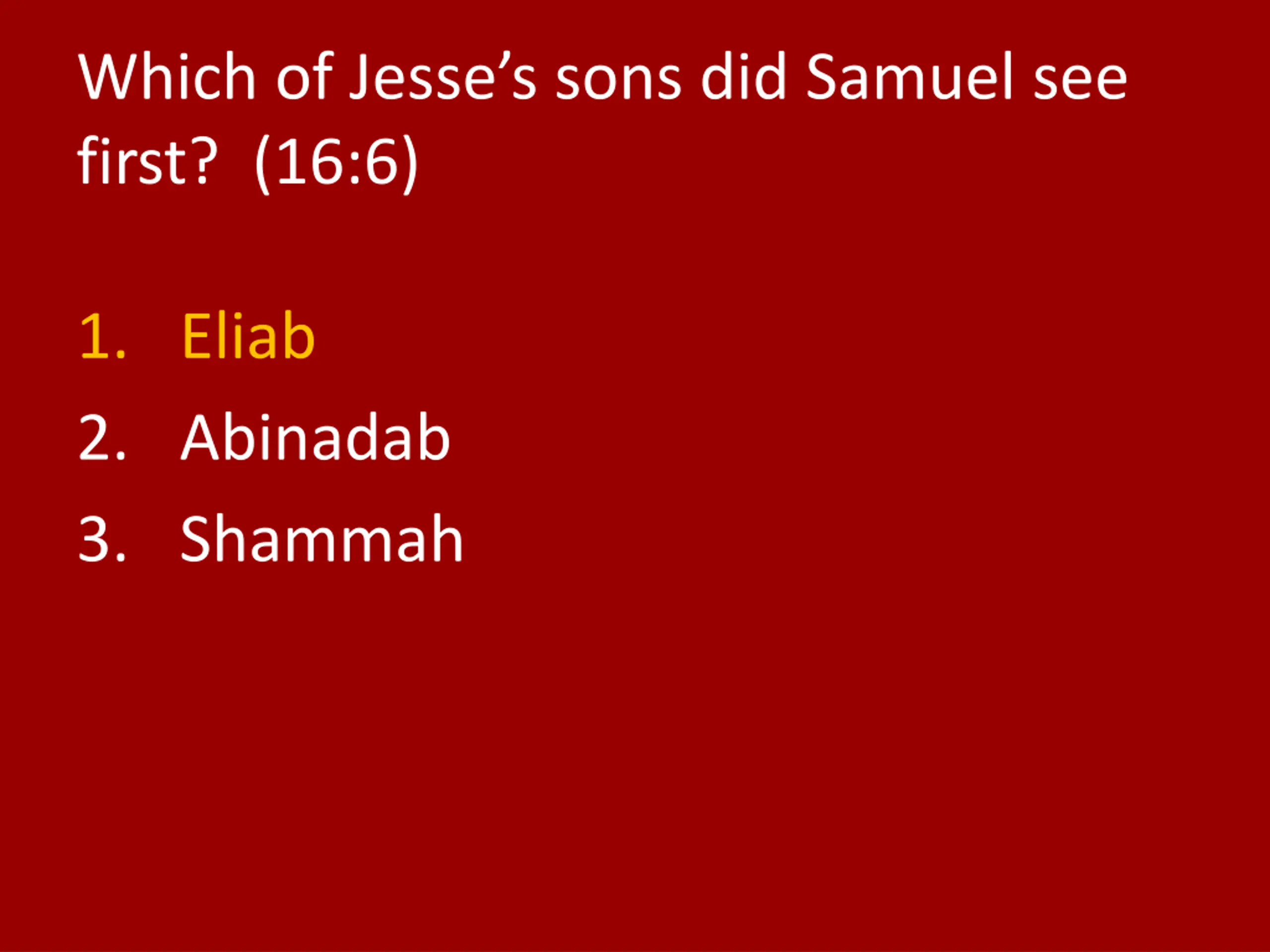 Which of Jesses sons did Samuel see first? (16:6) 1. Eliab 2. Abinadab 3. Shammah