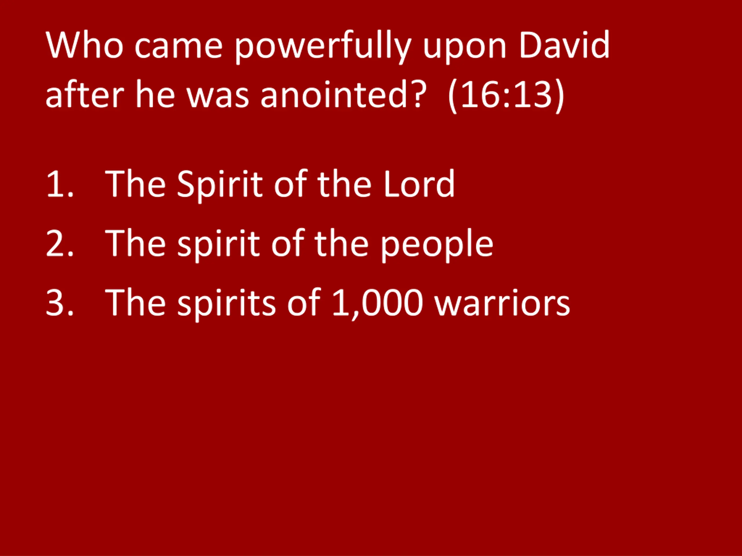 Who came powerfully upon David after he was anointed? (16:13) 1. The Spirit of the Lord 2. The spirit of the people 3. The spirits of 1,000 warriors
