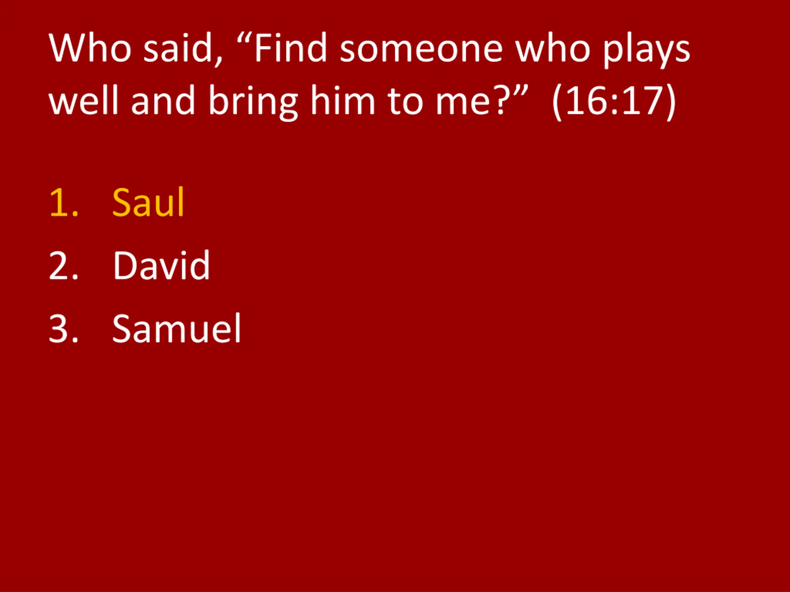 Who said, Find someone who plays well and bring him to me? (16:17) 1. Saul 2. David 3. Samuel