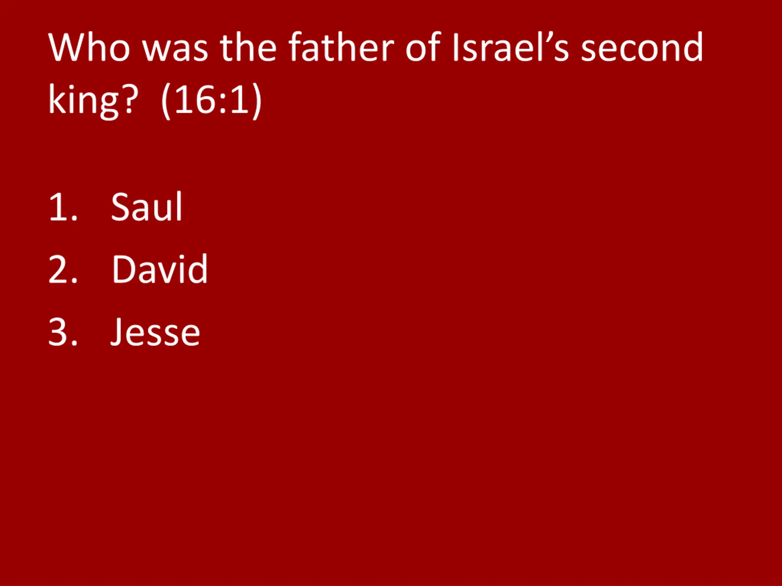 Who was the father of Israels second king? (16:1) 1. Saul 2. David 3. Jesse