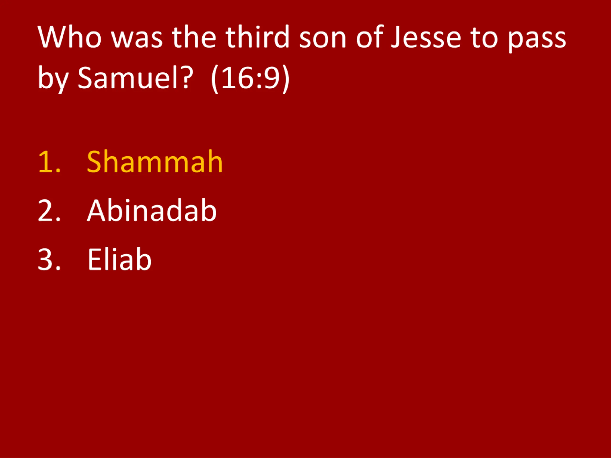 Who was the third son of Jesse to pass by Samuel? (16:9) 1. Shammah 2. Abinadab 3. Eliab