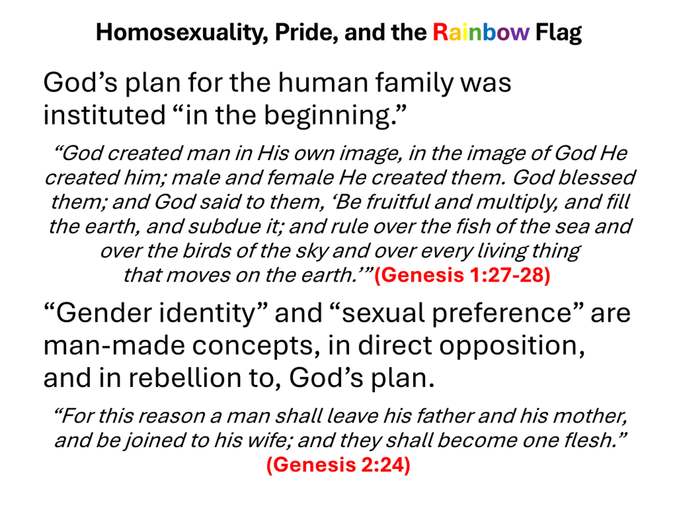 Homosexuality, Pride, and the Rainbow Flag God s plan for the human family was instituted in the beginning. God created man in His own image, in the image of God He created him;male and female He created them. God blessed them; and God said to them, Be fruitful and multiply, and fill the earth, and subdue it; and rule over the fish of the sea and over the birds of the sky and over every living thing thatmoves on the earth. (Genesis 1:27-28) Gender identity and sexual preference are man-made concepts, in direct opposition, and in rebellion to, God s plan. For this reason a man shall leave his father and his mother, and be joined to his wife; and they shall become one flesh. (Genesis 2:24)