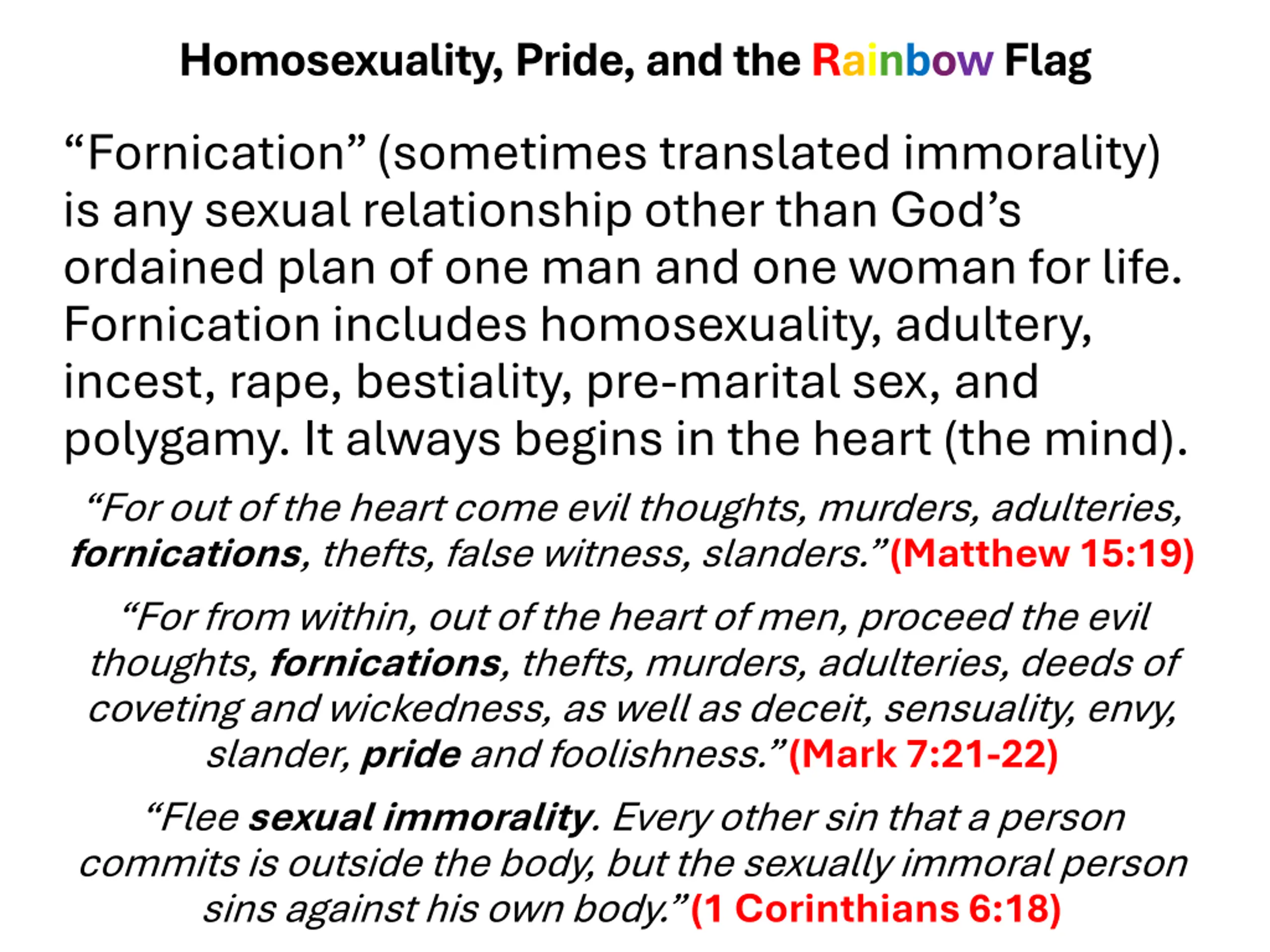 Homosexuality, Pride, and the Rainbow Flag Fornication (sometimes translated immorality) is any sexual relationship other than God s ordained plan of one man and one woman for life. Fornication includes homosexuality, adultery, incest, rape, bestiality, pre-marital sex, and polygamy. It always begins in the heart (the mind). For out of the heart come evil thoughts, murders, adulteries, fornications, thefts, false witness, slanders. (Matthew 15:19) For from within, out of the heart of men, proceed the evil thoughts, fornications, thefts, murders, adulteries, deeds of coveting and wickedness, as well as deceit, sensuality, envy, slander, pride and foolishness. (Mark 7:21-22) Flee sexual immorality. Every other sin that a person commits is outside the body, but the sexually immoral person sins against his own body. (1 Corinthians 6:18)