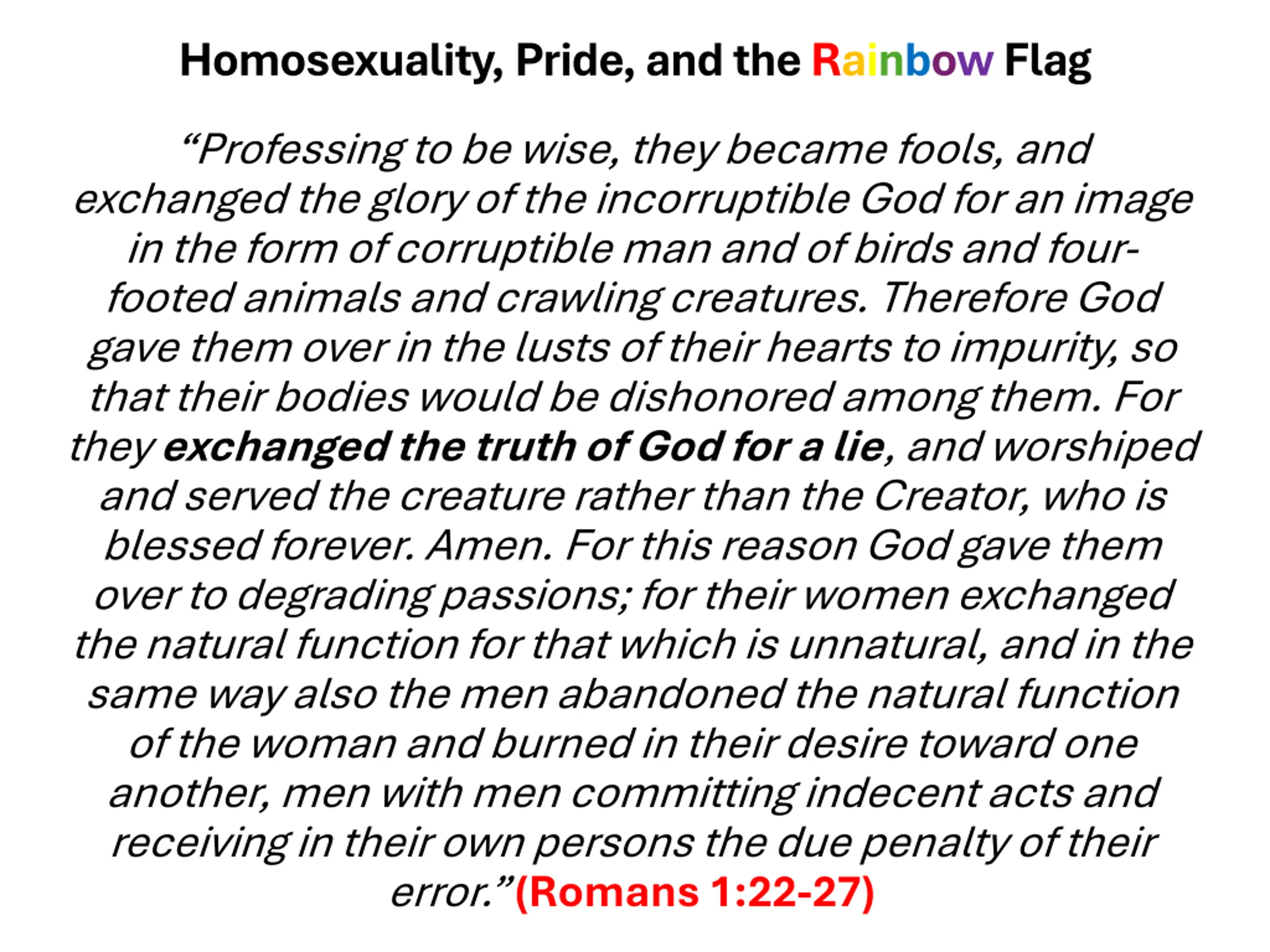 Homosexuality, Pride, and the Rainbow Flag Professing to be wise, they became fools, and exchanged the glory of the incorruptible God for an image in the form of corruptible man and of birds and four- footed animals and crawling creatures. Therefore God gave them over in the lusts of their hearts to impurity, so that their bodies would be dishonored among them. For they exchanged the truth of God for a lie, and worshiped and served the creature rather than the Creator, who is blessed forever. Amen. For this reason God gave them over to degrading passions; for their women exchanged the natural function for that which is unnatural, and in the same way also the men abandoned the natural function of the woman and burned in their desire toward one another, men with men committing indecent acts and receiving in their own persons the due penalty of their error. (Romans 1:22-27)