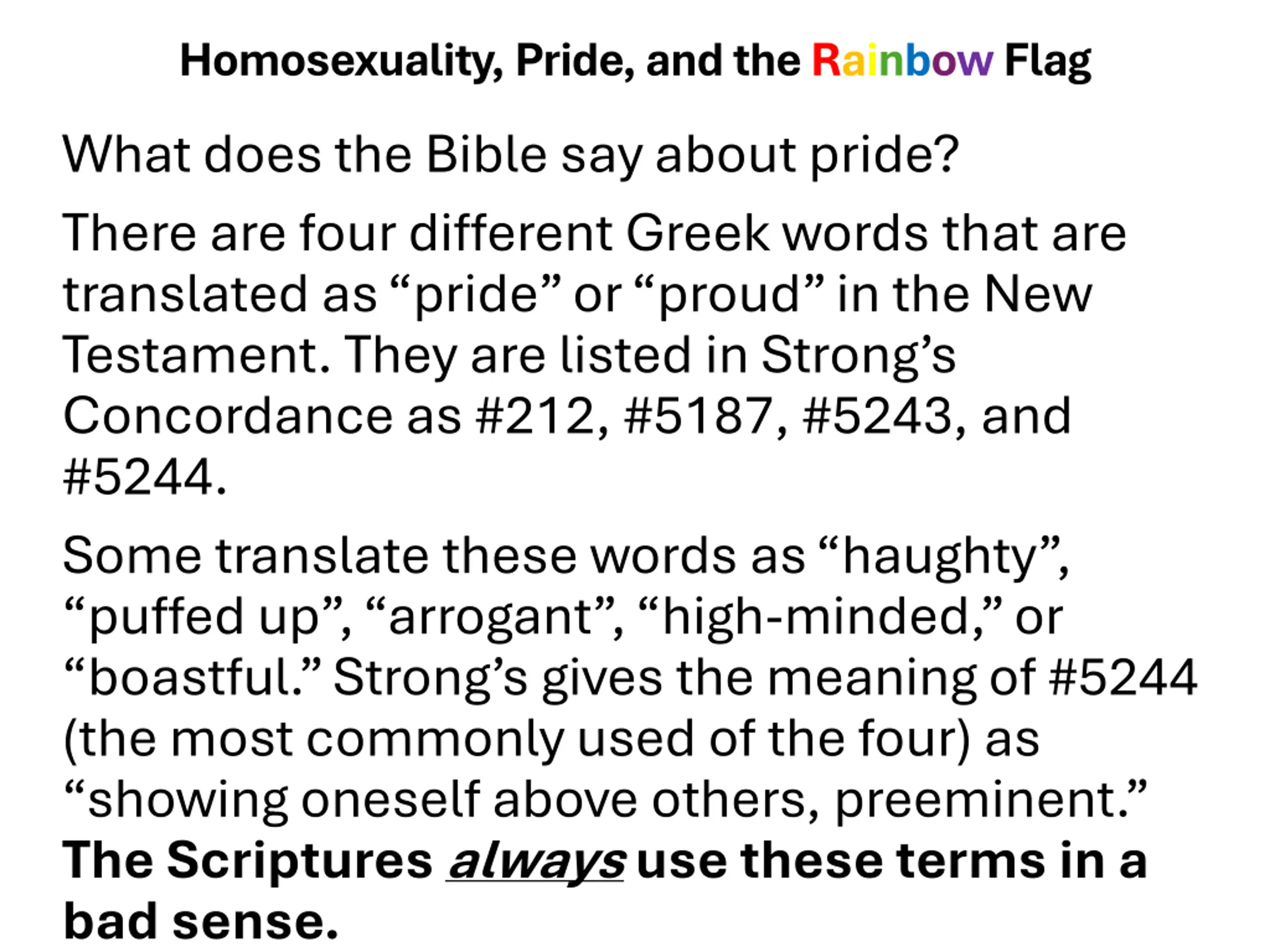Homosexuality, Pride, and the Rainbow Flag What does the Bible say about pride? There are four different Greek words that are translated as pride or proud in the New Testament. They are listed in Strong s Concordance as #212, #5187, #5243, and #5244. Some translate these words as haughty , puffed up , arrogant , high-minded, or boastful. Strong s gives the meaning of #5244 (the most commonly used of the four) as showing oneself above others, preeminent. The Scriptures always use these terms in a bad sense.