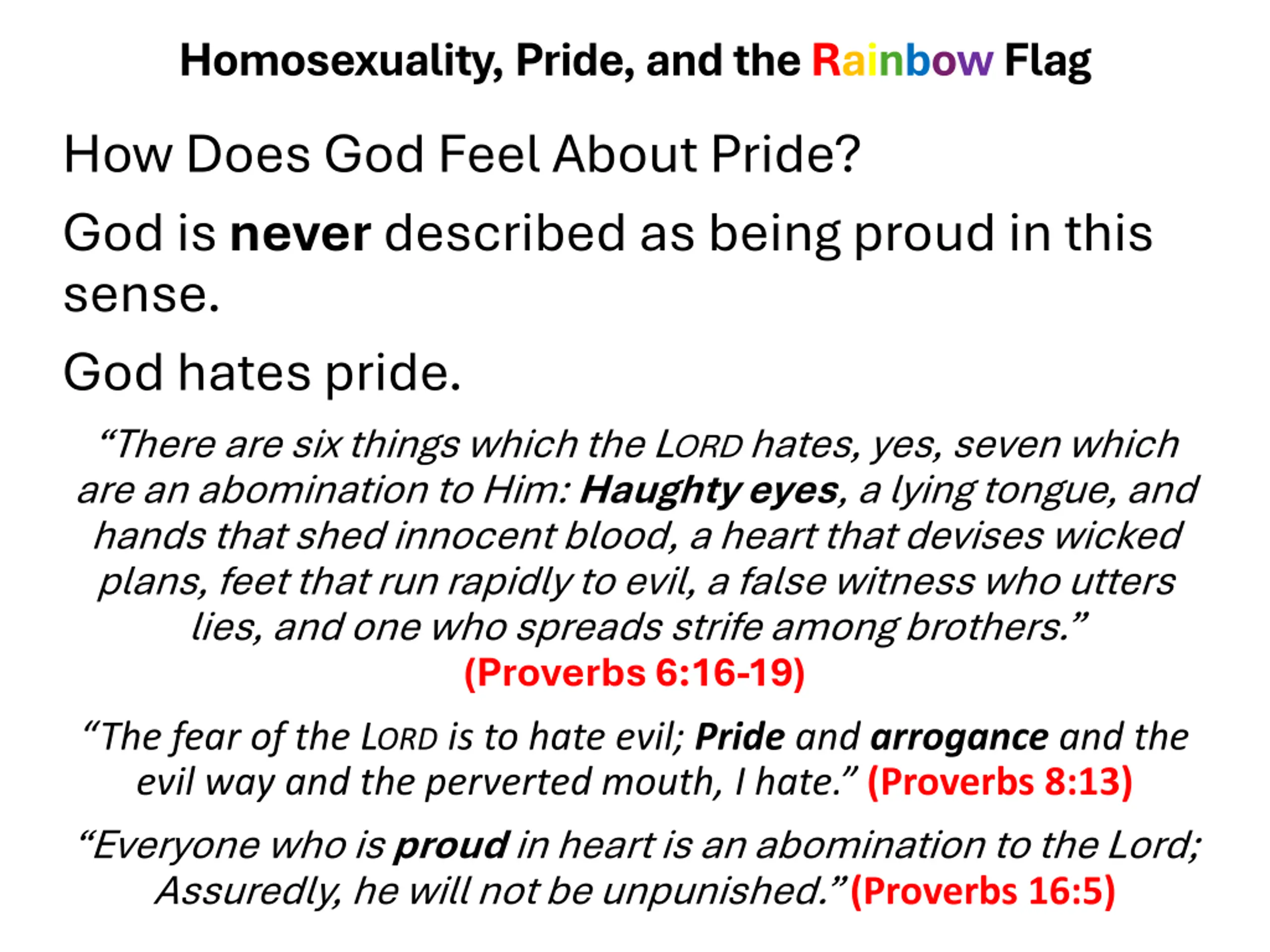 Homosexuality, Pride, and the Rainbow Flag How Does God Feel About Pride? God is neverdescribed as being proud in this sense. God hates pride. There are six things which the LORD hates, yes, seven which are an abomination to Him: Haughty eyes, a lying tongue, and hands thatshed innocent blood, a heart that devises wicked plans, feet that run rapidly to evil, a false witness who utters lies, and one who spreads strife among brothers. (Proverbs 6:16-19) The fear of the LORD is to hate evil; Pride and arrogance and the evil way and the perverted mouth, I hate. (Proverbs 8:13) Everyone who is proud in heart is an abomination to the Lord; Assuredly, he will not be unpunished. (Proverbs 16:5)
