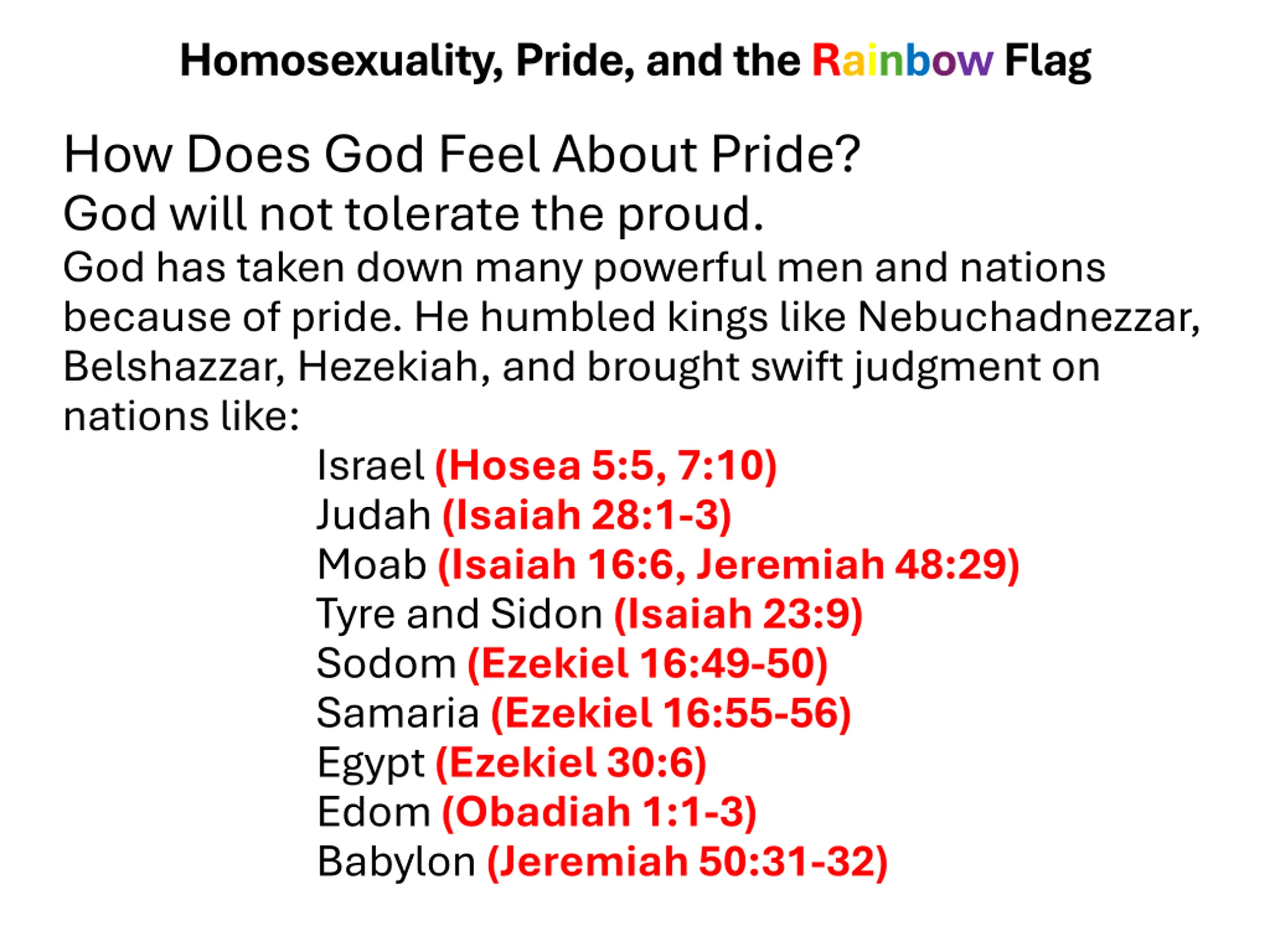 Homosexuality, Pride, and the Rainbow Flag How Does God Feel About Pride? God will not tolerate the proud. God has taken down many powerful men and nations because of pride. He humbled kings like Nebuchadnezzar, Belshazzar, Hezekiah, and brought swift judgment on nations like: Israel (Hosea 5:5, 7:10) Judah (Isaiah 28:1-3) Moab (Isaiah 16:6, Jeremiah 48:29) Tyre and Sidon (Isaiah 23:9) Sodom (Ezekiel 16:49-50) Samaria (Ezekiel 16:55-56) Egypt (Ezekiel 30:6) Edom (Obadiah 1:1-3) Babylon (Jeremiah 50:31-32)