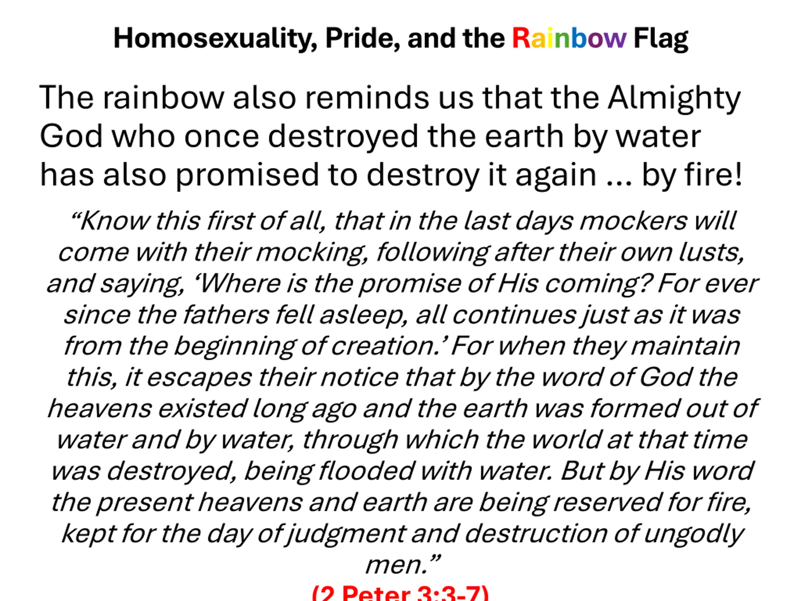 Homosexuality, Pride, and the Rainbow Flag The rainbow also reminds us that the Almighty God who once destroyed the earth by water has also promised to destroy it again by fire! Know this first of all, that in the last days mockers will come with their mocking, following after their own lusts, and saying, Where is the promise of His coming? For ever since the fathers fell asleep, all continues just as it was from the beginning of creation. For when they maintain this, it escapes their notice that by the word of God the heavens existed long ago and the earth was formed out of water and by water, through which the world at that time was destroyed, being flooded with water. But by His word the present heavens and earth are being reserved for fire, kept for the day of judgment and destruction of ungodly men. (2 Peter 3:3-7)