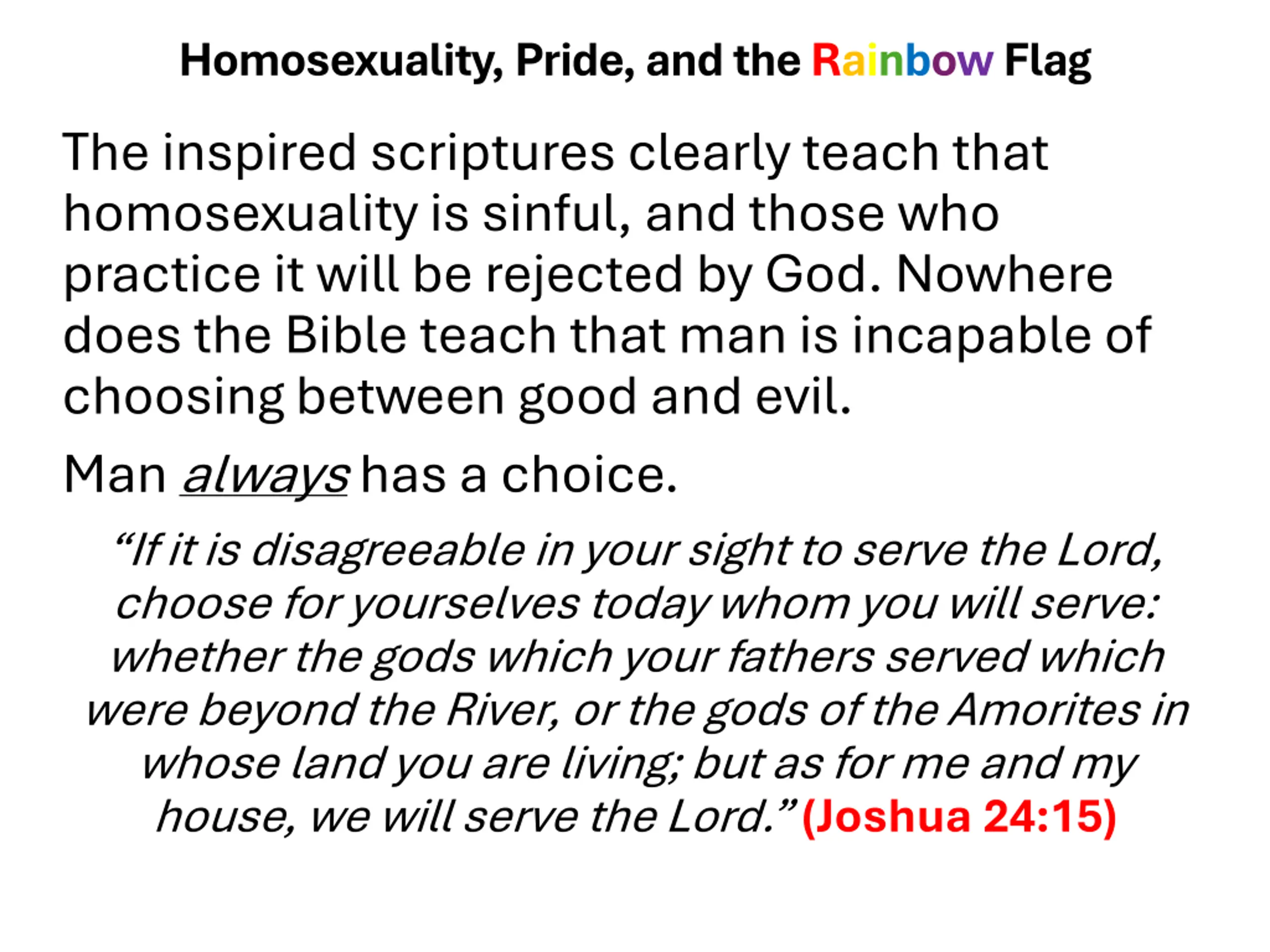 Homosexuality, Pride, and the Rainbow Flag The inspired scriptures clearly teach that homosexuality is sinful, and those who practice it will be rejected by God. Nowhere does the Bible teach that man is incapable of choosing between good and evil. Man always has a choice. If it is disagreeable in your sight to serve the Lord, choose for yourselves today whom you will serve: whether the gods which your fathers served which were beyond the River, or the gods of the Amorites in whose land you are living; but as for me and my house, we will serve the Lord. (Joshua 24:15)