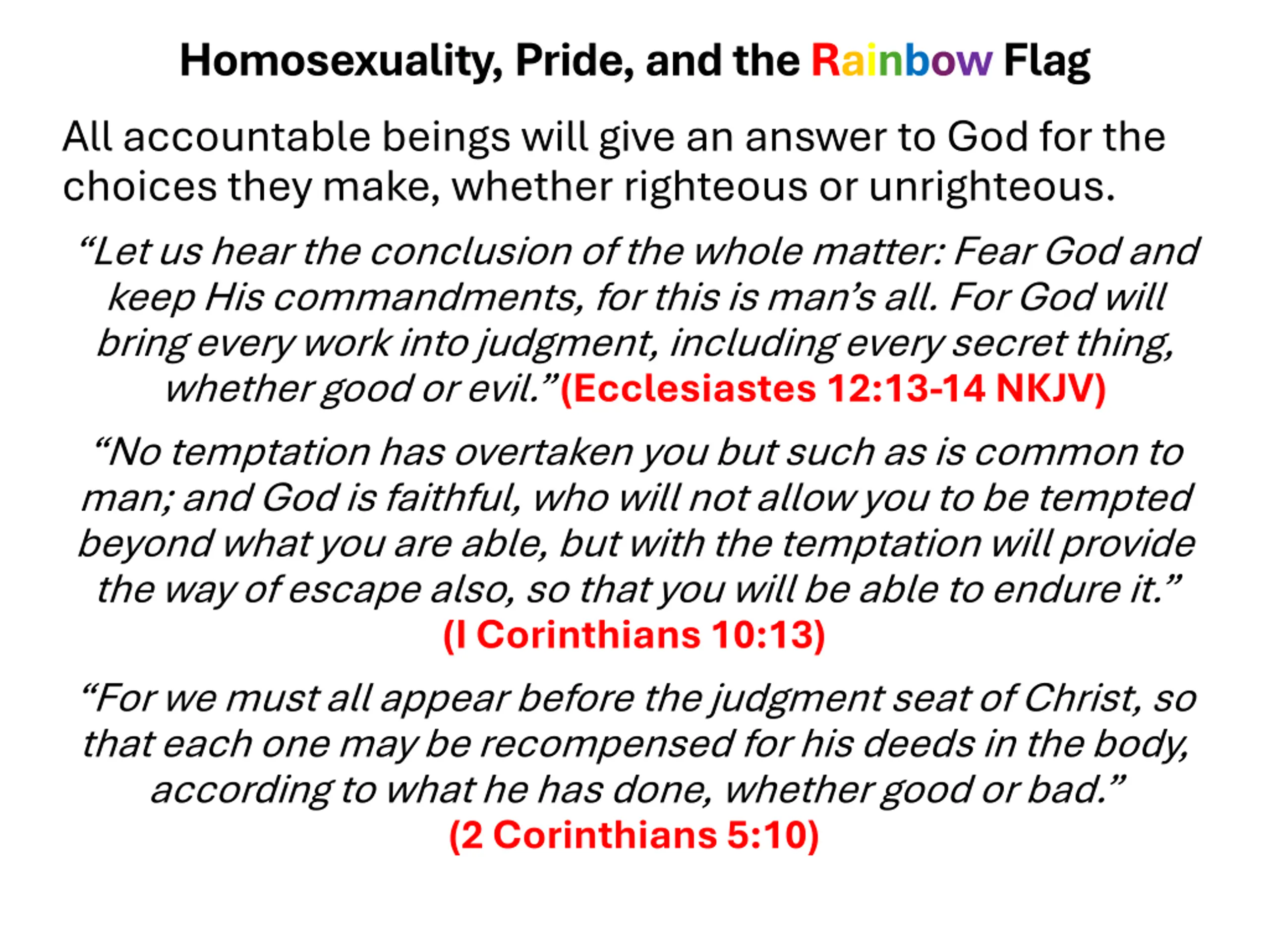 Homosexuality, Pride, and the Rainbow Flag All accountable beings will give an answer to God for the choices they make, whether righteous or unrighteous. Let us hear the conclusion of the whole matter: Fear God and keep His commandments, for this is man s all. For God will bring every work into judgment, including every secret thing, whether good or evil. (Ecclesiastes 12:13-14 NKJV) No temptation has overtaken you but such as is common to man; and God is faithful, who will not allow you to be tempted beyond what you are able, but with the temptation will provide the way of escape also, so that you will be able to endure it. (I Corinthians 10:13) For we must all appear before the judgment seat of Christ, so that each one may be recompensed for his deeds in the body, according to what he has done, whether good or bad. (2 Corinthians 5:10)