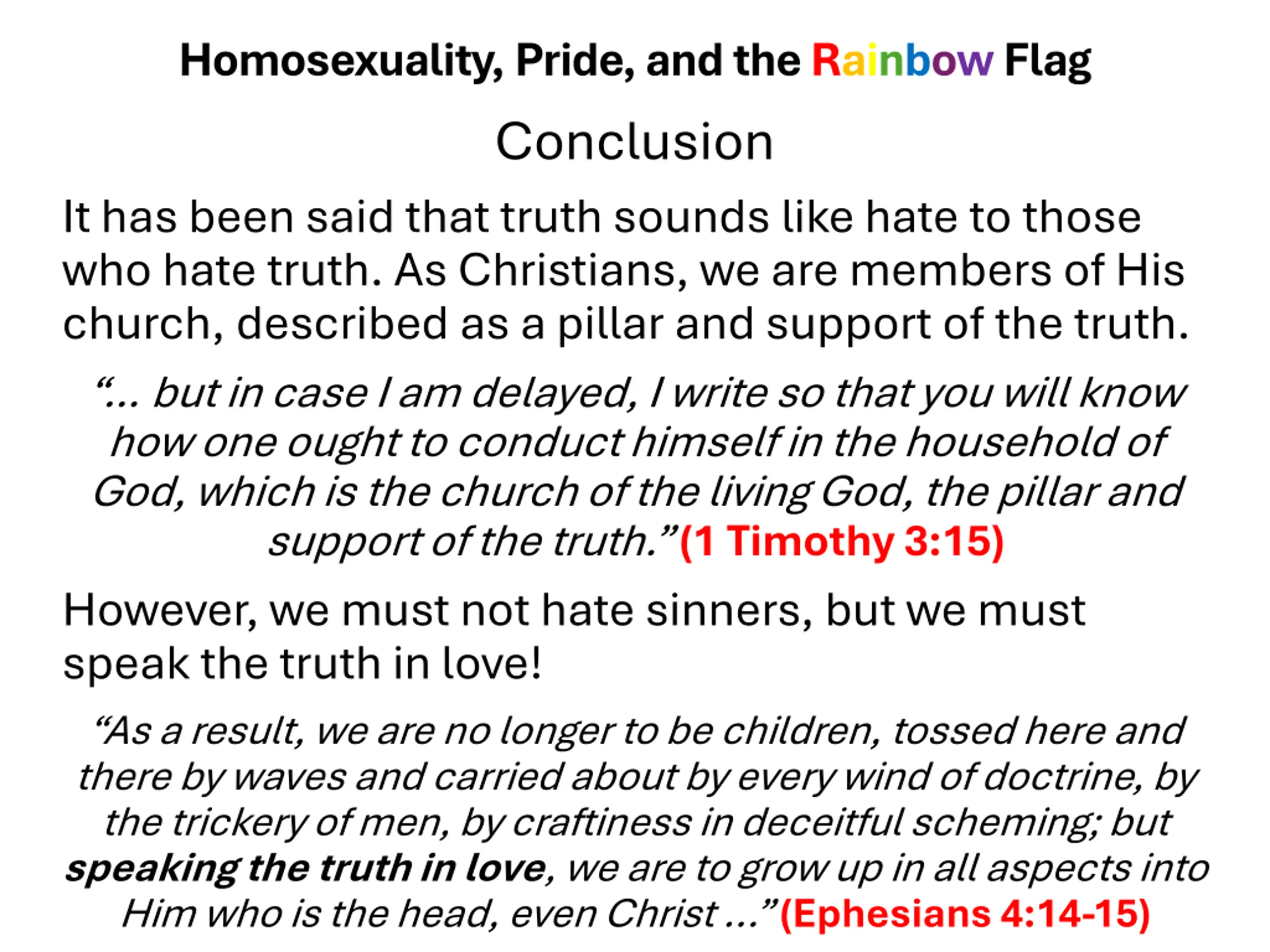 Homosexuality, Pride, and the Rainbow Flag Conclusion It has been said that truth sounds like hate to those who hate truth. As Christians, we are members of His church, described as a pillar and support of the truth. but in case I am delayed, I write so that you will know how one ought to conduct himself in the household of God, which is the church of the living God, the pillar and support of the truth. (1 Timothy 3:15) However, we must not hate sinners, but we must speak the truth in love! As a result, we are no longer to be children, tossed here and there by waves and carried about by every wind of doctrine, by the trickery of men, by craftiness in deceitful scheming; but speaking the truth in love, we are to grow up in all aspects into Him who is the head, even Christ ... (Ephesians 4:14-15)
