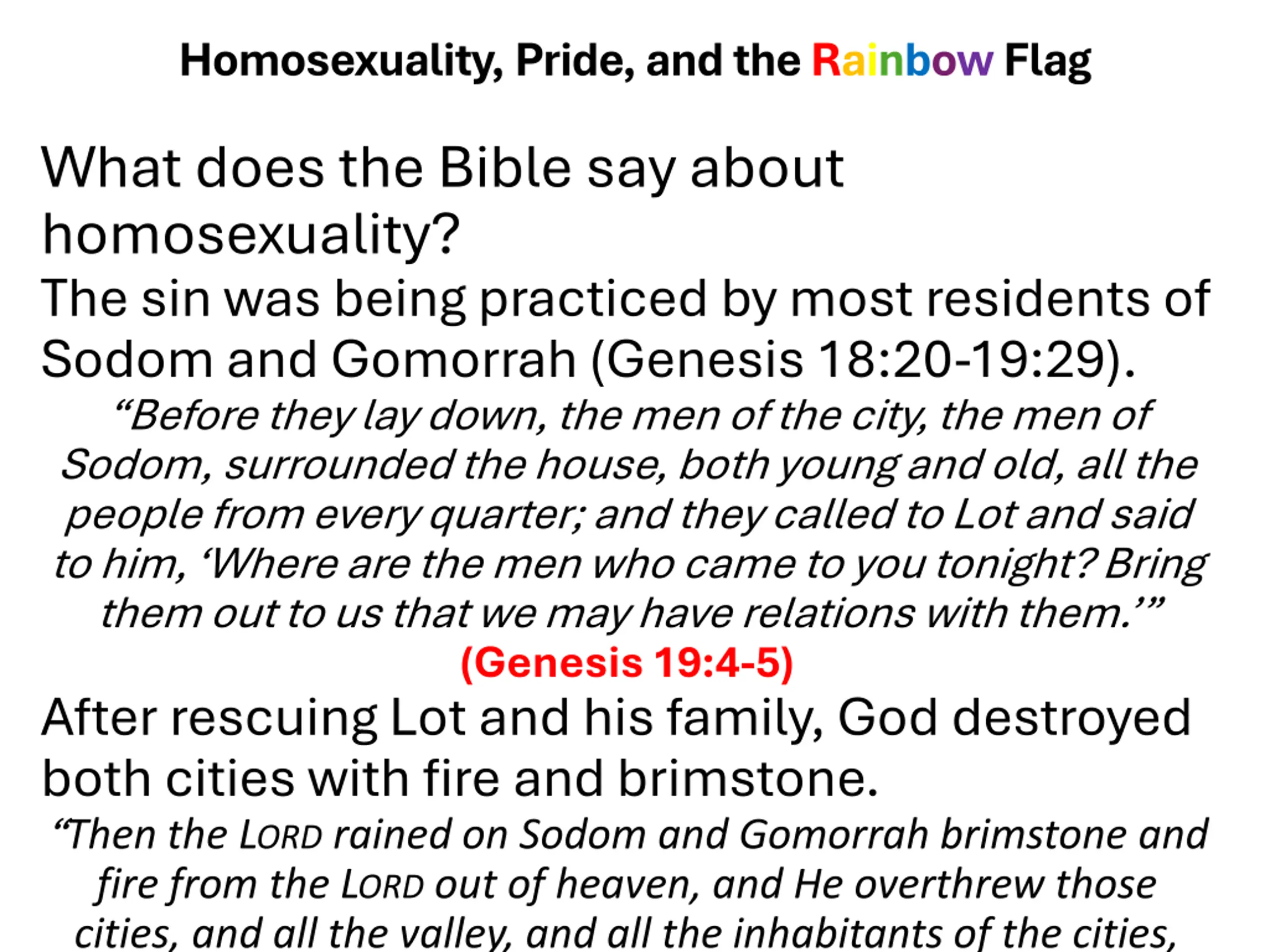 Homosexuality, Pride, and the Rainbow Flag What does the Bible say about homosexuality? The sin was being practiced by most residents of Sodom and Gomorrah (Genesis 18:20-19:29). Before they lay down, the men of the city, the men of Sodom, surrounded the house, both young and old, all the people from every quarter; and they called to Lot and said to him, Where are the men who came to you tonight? Bring them out to us that we may have relations with them. (Genesis 19:4-5) After rescuing Lot and his family, God destroyed both cities with fire and brimstone. Then the LORD rained on Sodom and Gomorrah brimstone and fire from the LORD out of heaven, and He overthrew those cities, and all the valley, and all the inhabitants of the cities, and what grew on the ground.
