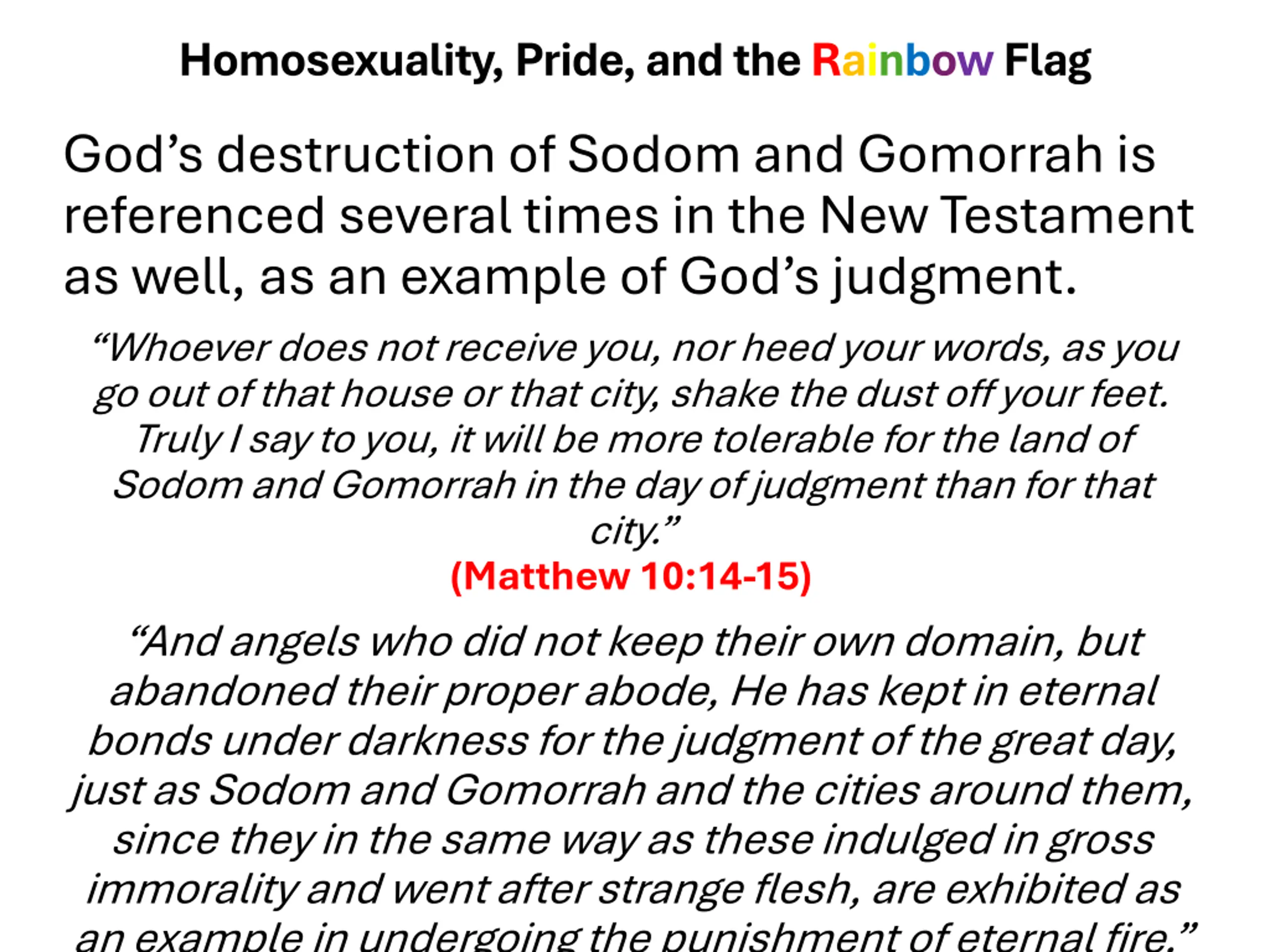 Homosexuality, Pride, and the Rainbow Flag God s destruction of Sodom and Gomorrah is referenced several times in the New Testament as well, as an example of God s judgment. Whoever does not receive you, nor heed your words, as you go out of that house or that city, shake the dust off your feet. Truly I say to you, it will be more tolerable for the land of Sodom and Gomorrah in the day of judgment than for that city. (Matthew 10:14-15) And angels who did not keep their own domain, but abandoned their proper abode, He has kept in eternal bonds under darkness for the judgment of the great day, just as Sodom and Gomorrah and the cities around them, since they in the same way as these indulged in gross immorality and went after strange flesh, are exhibited as an example in undergoing the punishment of eternal fire.