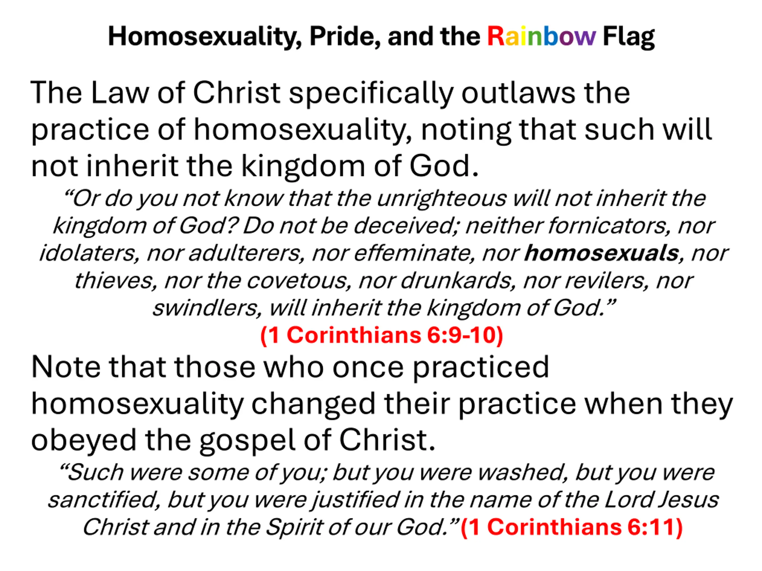 Homosexuality, Pride, and the Rainbow Flag The Law of Christ specifically outlaws the practice of homosexuality, noting that such will not inherit the kingdom of God. Or do you not know that the unrighteous will not inherit the kingdom of God? Do not be deceived; neither fornicators, nor idolaters, nor adulterers, nor effeminate, nor homosexuals, nor thieves, nor the covetous, nor drunkards, nor revilers, nor swindlers, will inherit the kingdom of God. (1 Corinthians 6:9-10) Note that those who once practiced homosexuality changed their practice when they obeyed the gospel of Christ. Such were some of you; but you were washed, but you were sanctified, but you were justified in the name of the Lord Jesus Christ and in the Spirit of our God. (1 Corinthians 6:11)
