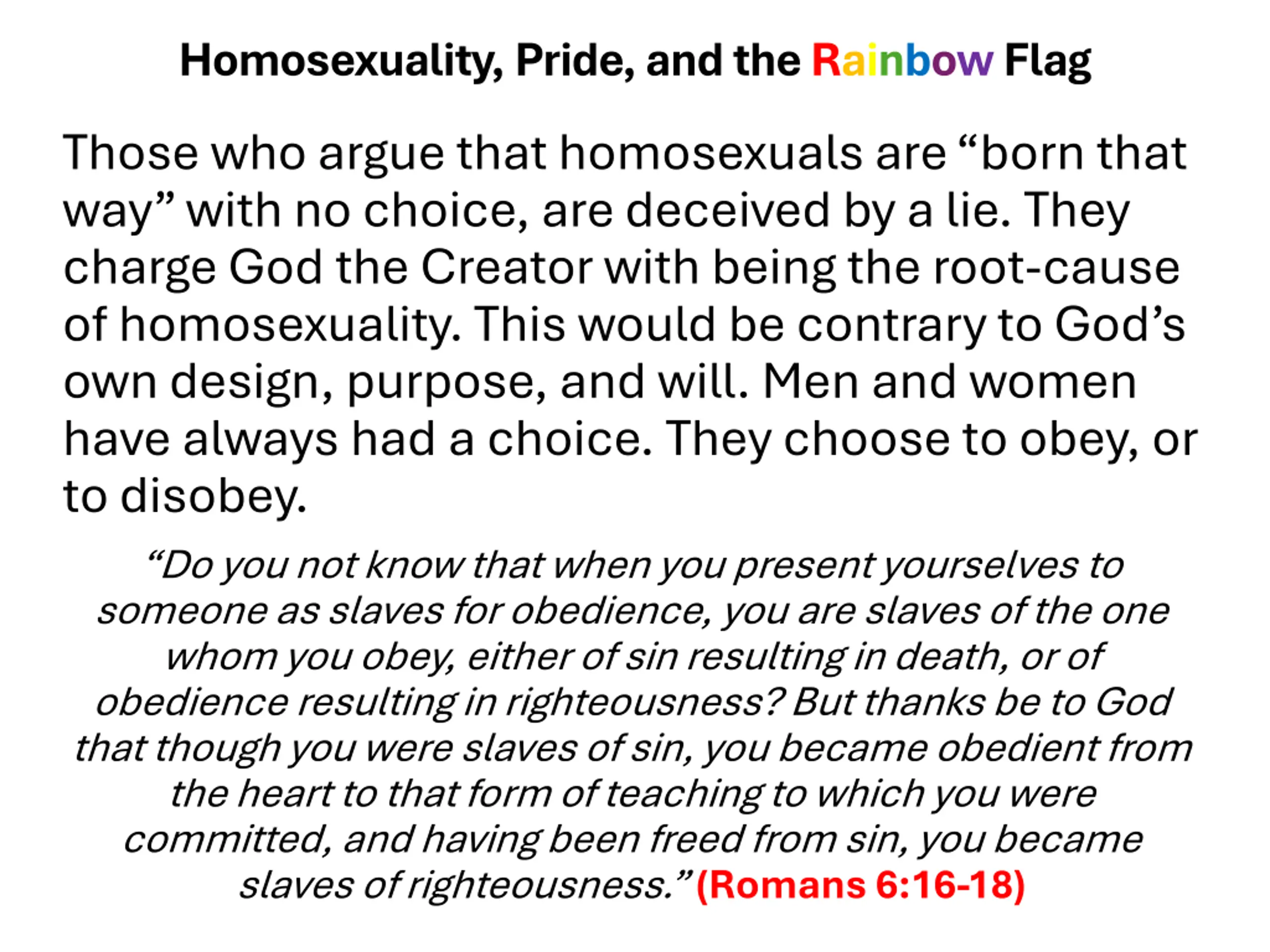 Homosexuality, Pride, and the Rainbow Flag Those who argue that homosexuals are born that way with no choice, are deceived by a lie. They charge God the Creator with being the root-cause of homosexuality. This would be contrary to God s own design, purpose, and will. Men and women have always had a choice. They choose to obey, or to disobey. Do you not know that when you present yourselves to someone as slaves for obedience, you are slaves of the one whom you obey, either of sin resulting in death, or of obedience resulting in righteousness? But thanks be to God that though you were slaves of sin, you became obedient from the heart to that form of teaching to which you were committed, and having been freed from sin, you became slaves of righteousness. (Romans 6:16-18)
