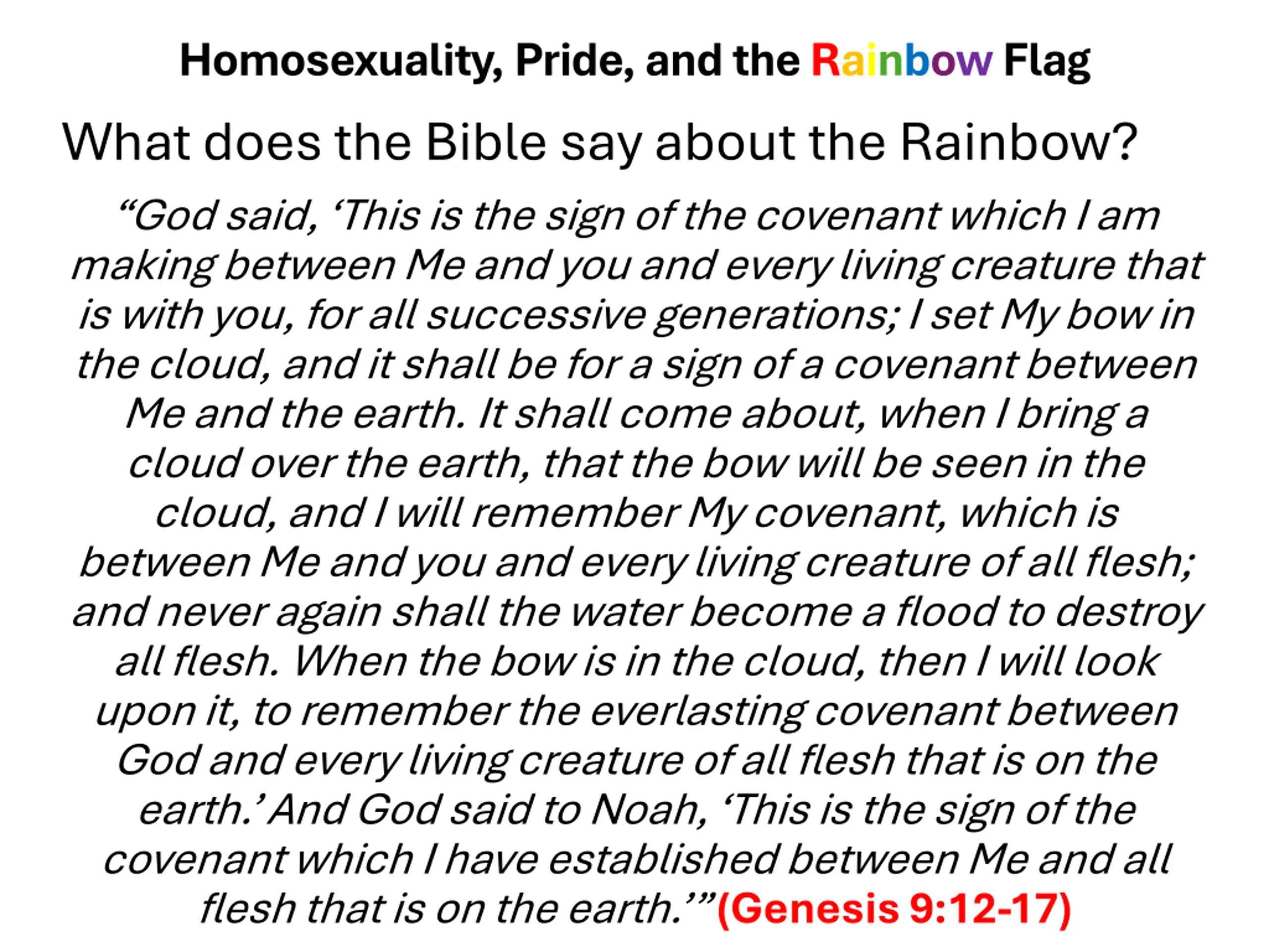 Homosexuality, Pride, and the Rainbow Flag What does the Bible say about the Rainbow? God said, This is the sign of the covenant which I am making between Me and you and every living creature that is with you, for all successive generations; I set My bow in the cloud, and it shall be for a sign of a covenant between Me and the earth. It shall come about, when I bring a cloud over the earth, that the bow will be seen in the cloud, and I will remember My covenant, which is between Me and you and every living creature of all flesh; and never again shall the water become a flood to destroy all flesh. When the bow is in the cloud, then I will look upon it, to remember the everlasting covenant between God and every living creature of all flesh that is on the earth. And God said to Noah, This is the sign of the covenant which I have established between Me and all flesh that is on the earth. (Genesis 9:12-17)