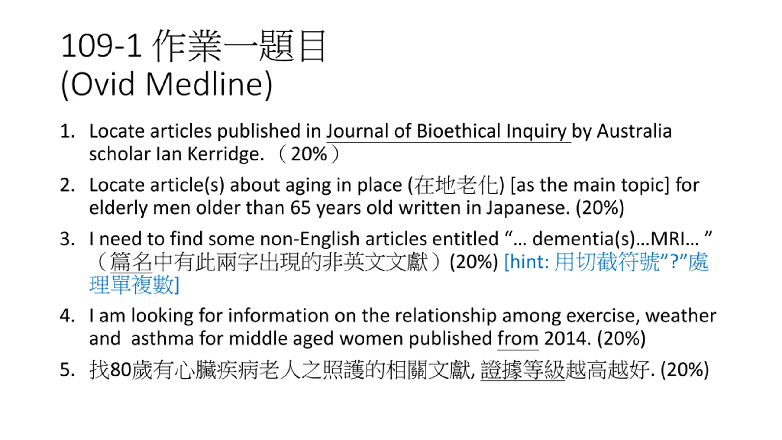 109-1 (Ovid Medline) 1. Locate articles published in Journal of Bioethical Inquiry by Australia scholar Ian Kerridge. 20% 2. Locate article(s) about aging in place ( ) [as the main topic] for elderly men older than 65 years old written in Japanese. (20%) 3. I need to find some non-English articles entitled dementia(s) MRI (20%) [hint: ? ] 4. I am looking for information on the relationship among exercise, weather and asthma for middle aged women published from 2014. (20%) 5. 80 , . (20%)