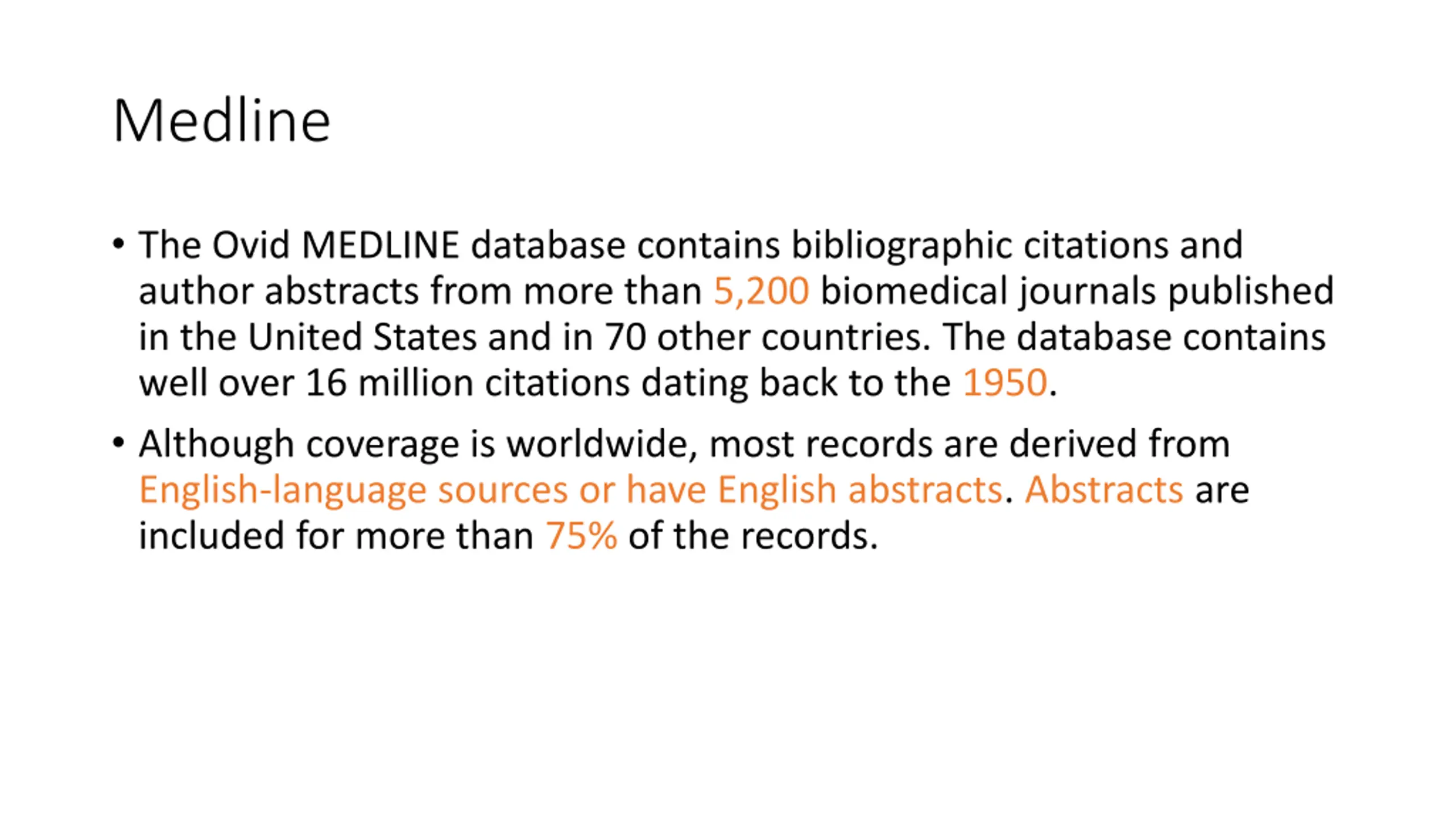 Medline The Ovid MEDLINE database contains bibliographic citations and author abstracts from more than 5,200 biomedical journals published in the United States and in 70 other countries. The database contains well over 16 million citations dating back to the 1950. Although coverage is worldwide, most records are derived from English-language sources or have English abstracts. Abstracts are included for more than 75% of the records.