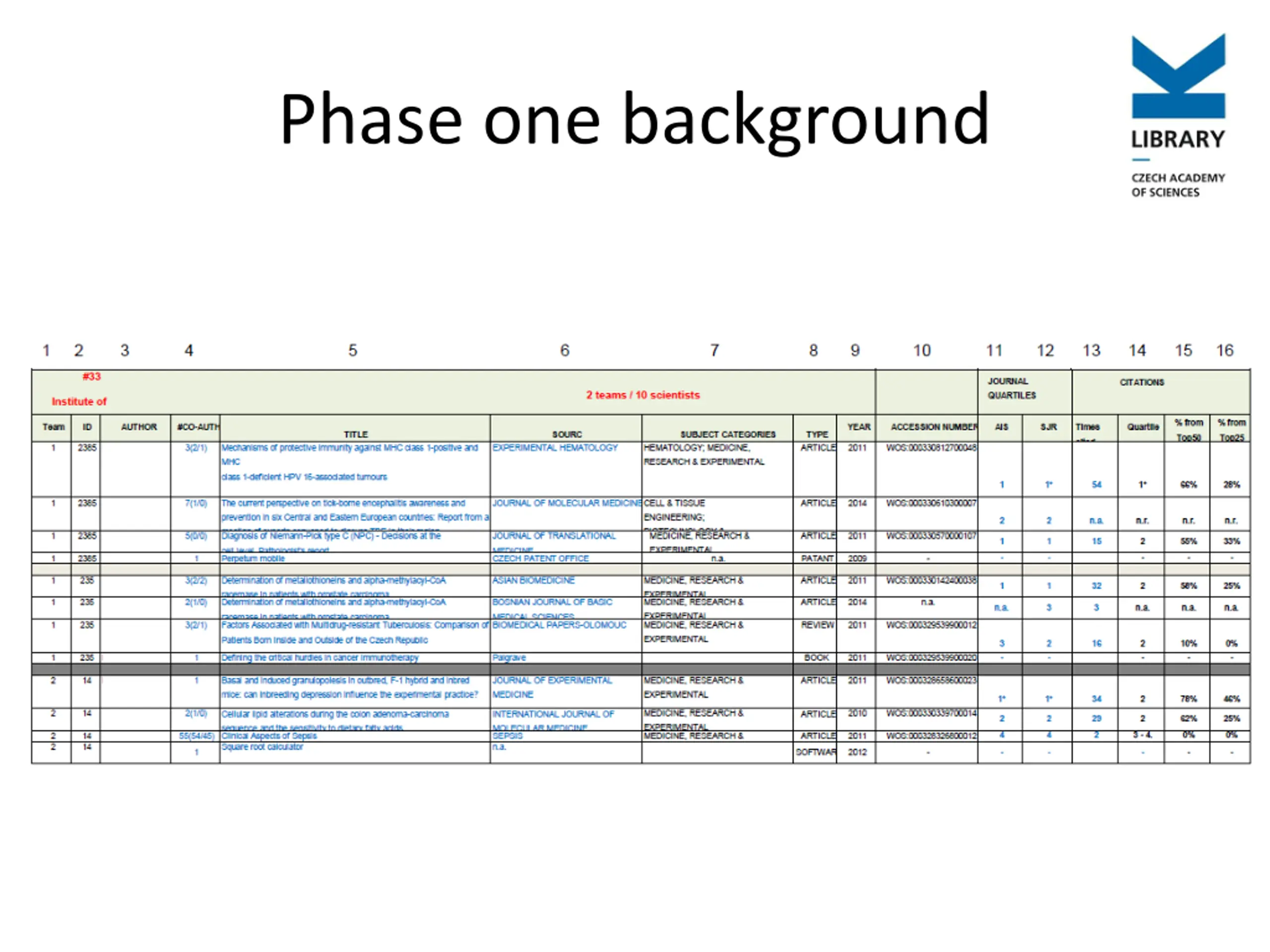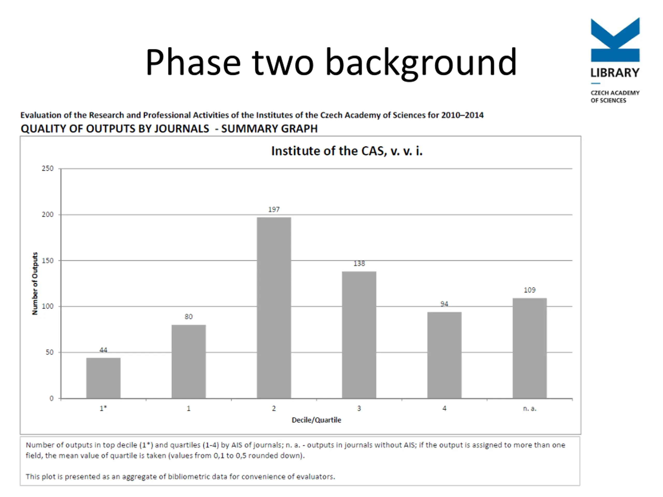 Bibliometrics as a background for evaluation Evaluations of institutions and teams in CAS in period 2010-2014 was splited into two phases. Phase one: Evaluation of choosen outputs Phase two: Evaluation of all outputs and analysis on national level