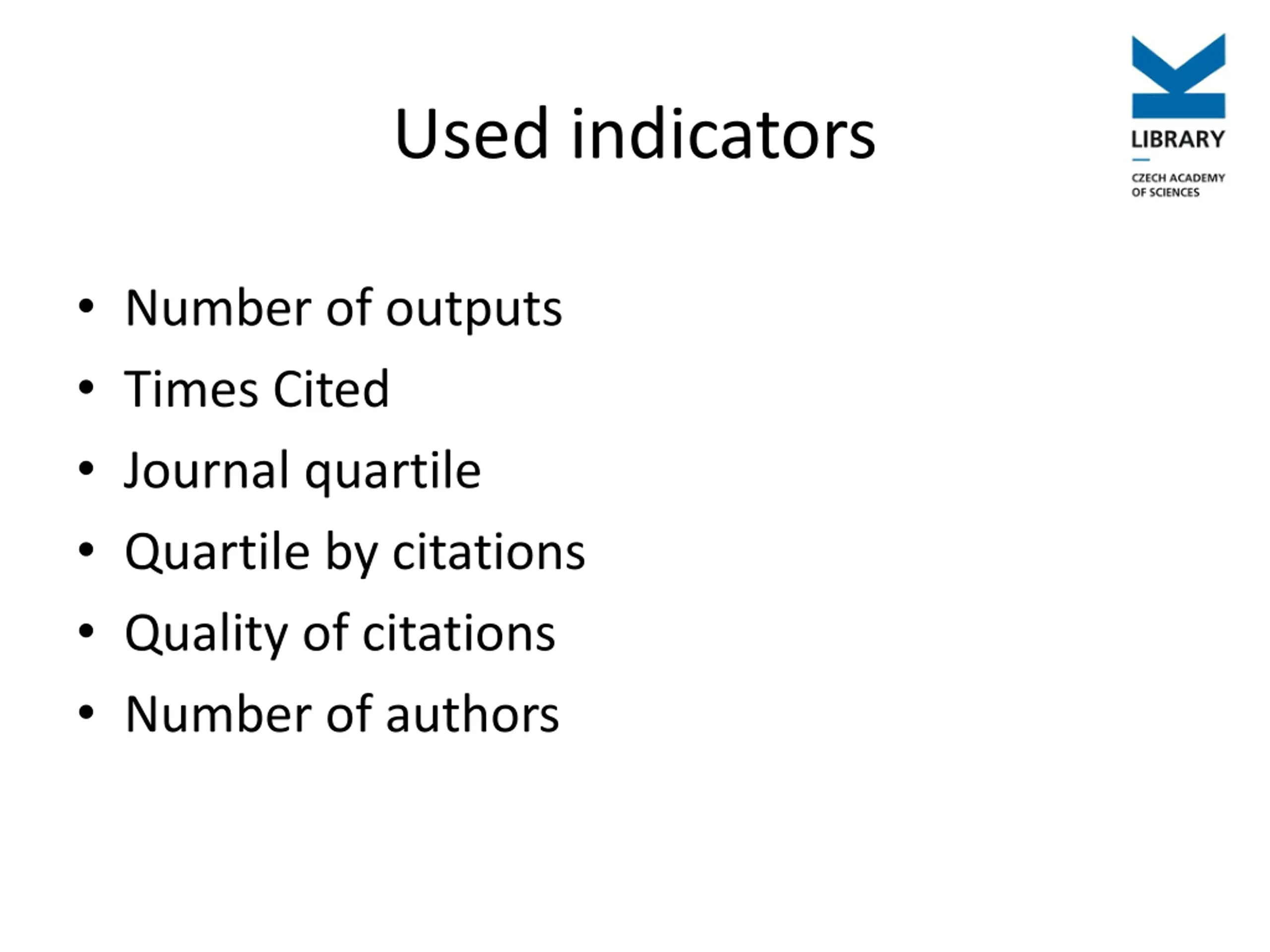 Used indicators Number of outputs Times Cited Journal quartile Quartile by citations Quality of citations Number of authors