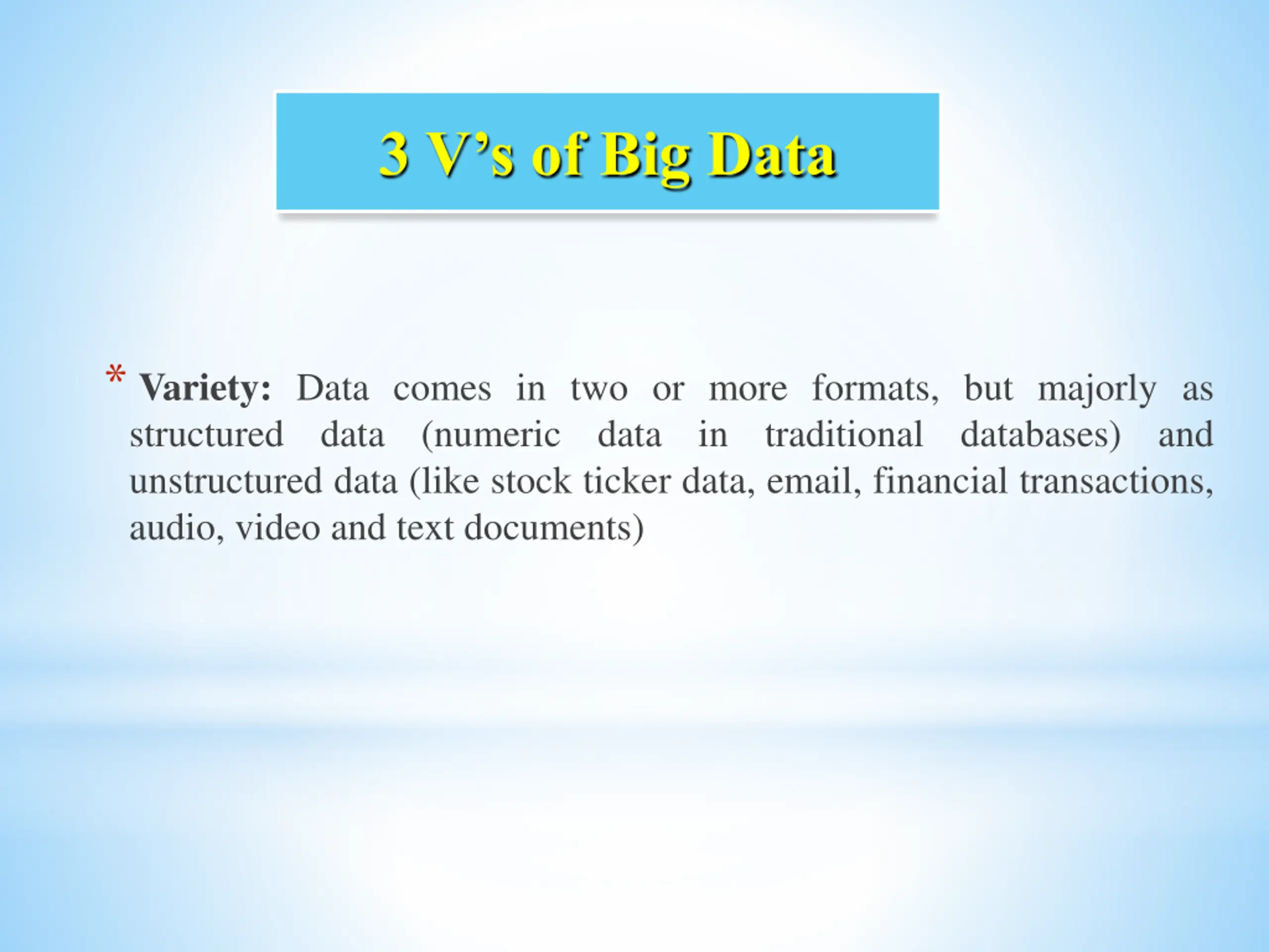 3 Vs of Big Data * Variety: Data comes in two or more formats, but majorly as structured data (numeric data in traditional databases) and unstructured data (like stock ticker data, email, financial transactions, audio, video and text documents)