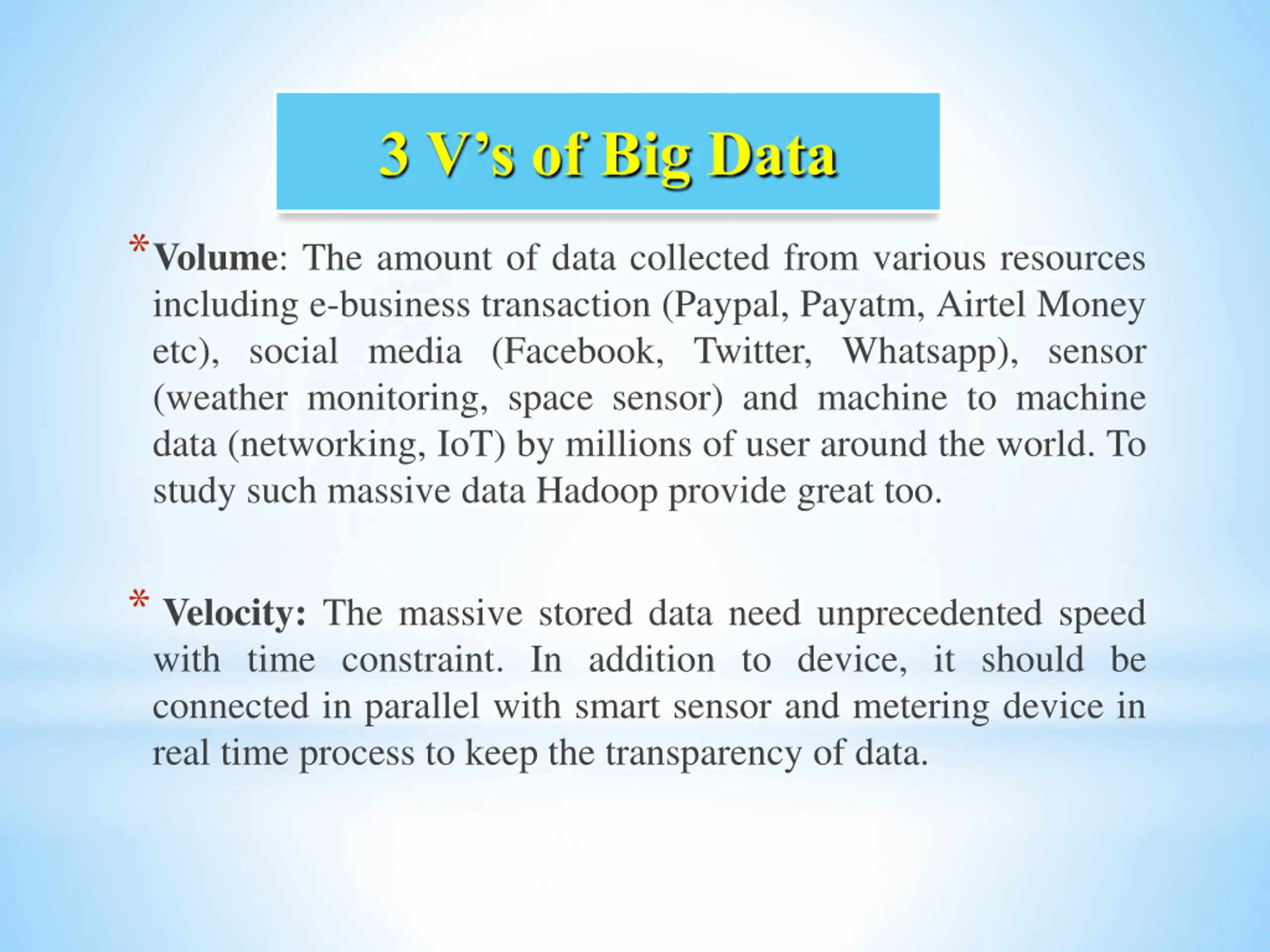 3 Vs of Big Data *Volume: The amount of data collected from various resources including e-business transaction (Paypal, Payatm, Airtel Money etc), social media (Facebook, Twitter, Whatsapp), sensor (weather monitoring, space sensor) and machine to machine data (networking, IoT) by millions of user around the world. To study such massive data Hadoop provide great too. *Velocity: The massive stored data need unprecedented speed with time constraint. In addition to device, it should be connected in parallel with smart sensor and metering device in real time process to keep the transparency of data.