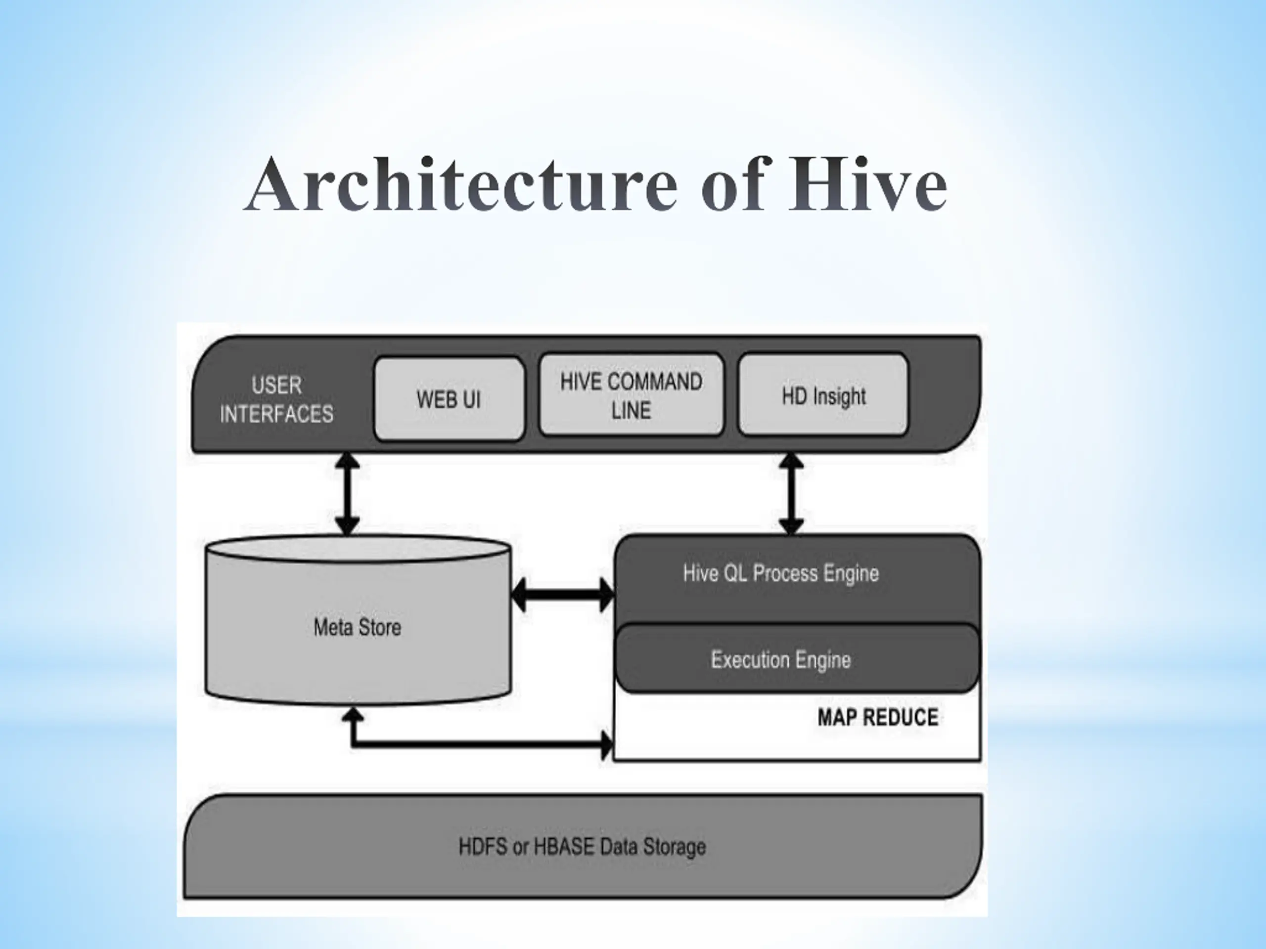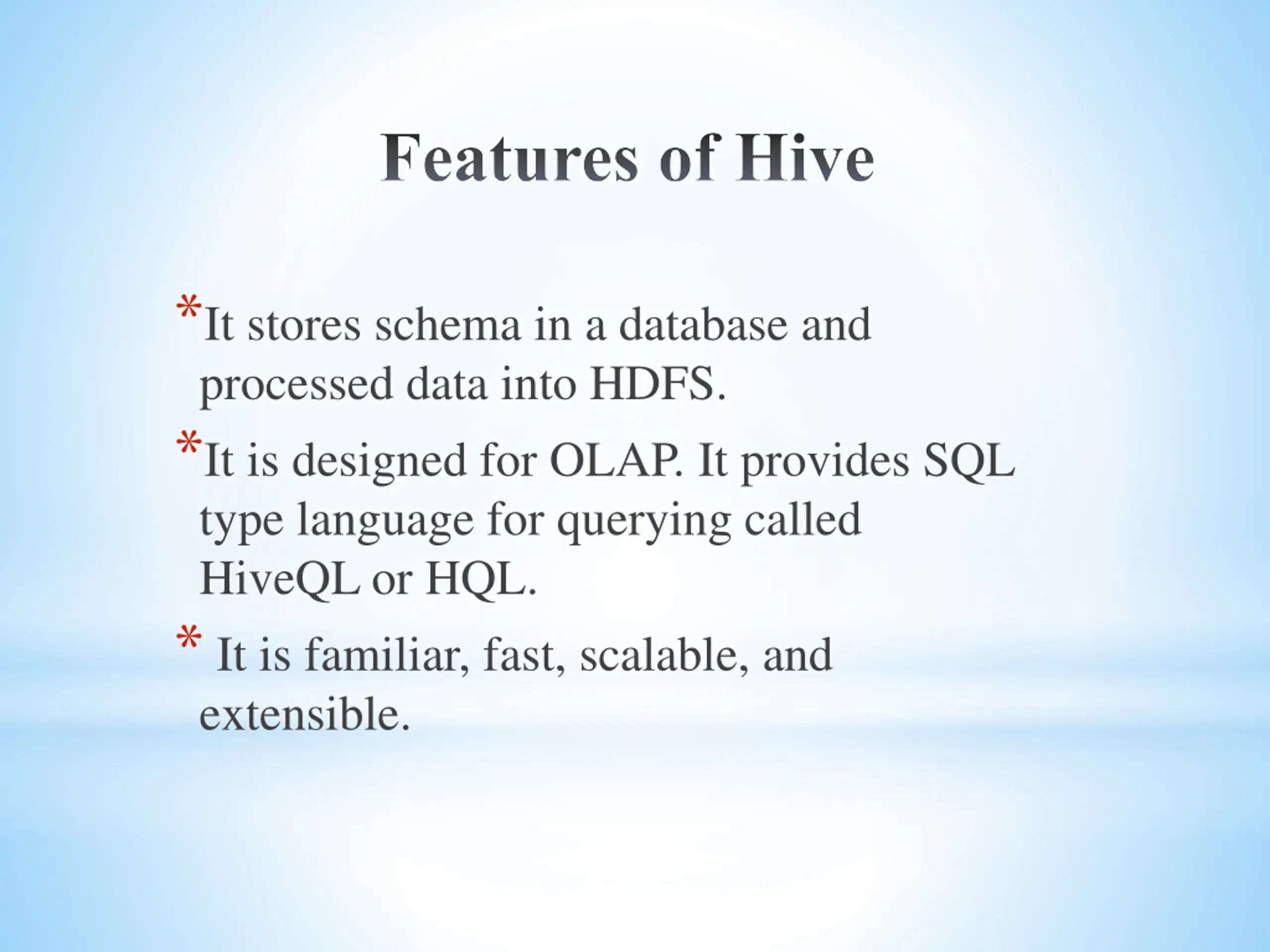 Features of Hive *It stores schema in a database and processed data into HDFS. *It is designed for OLAP. It provides SQL type language for querying called HiveQL or HQL. * It is familiar, fast, scalable, and extensible.