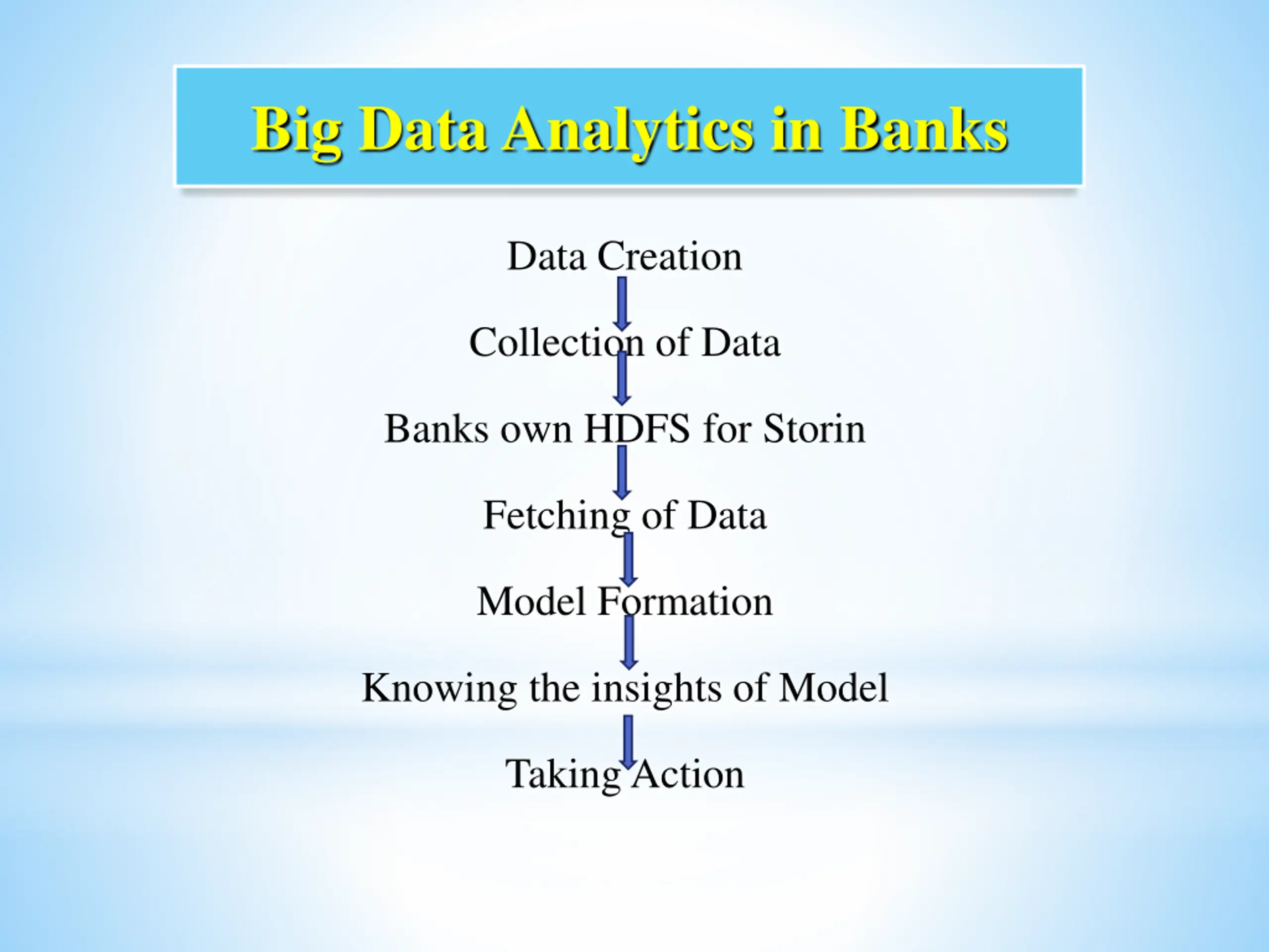 Big Data Analytics in Banks Data Creation Collection of Data Banks own HDFS for Storin Fetching of Data Model Formation Knowing the insights of Model Taking Action