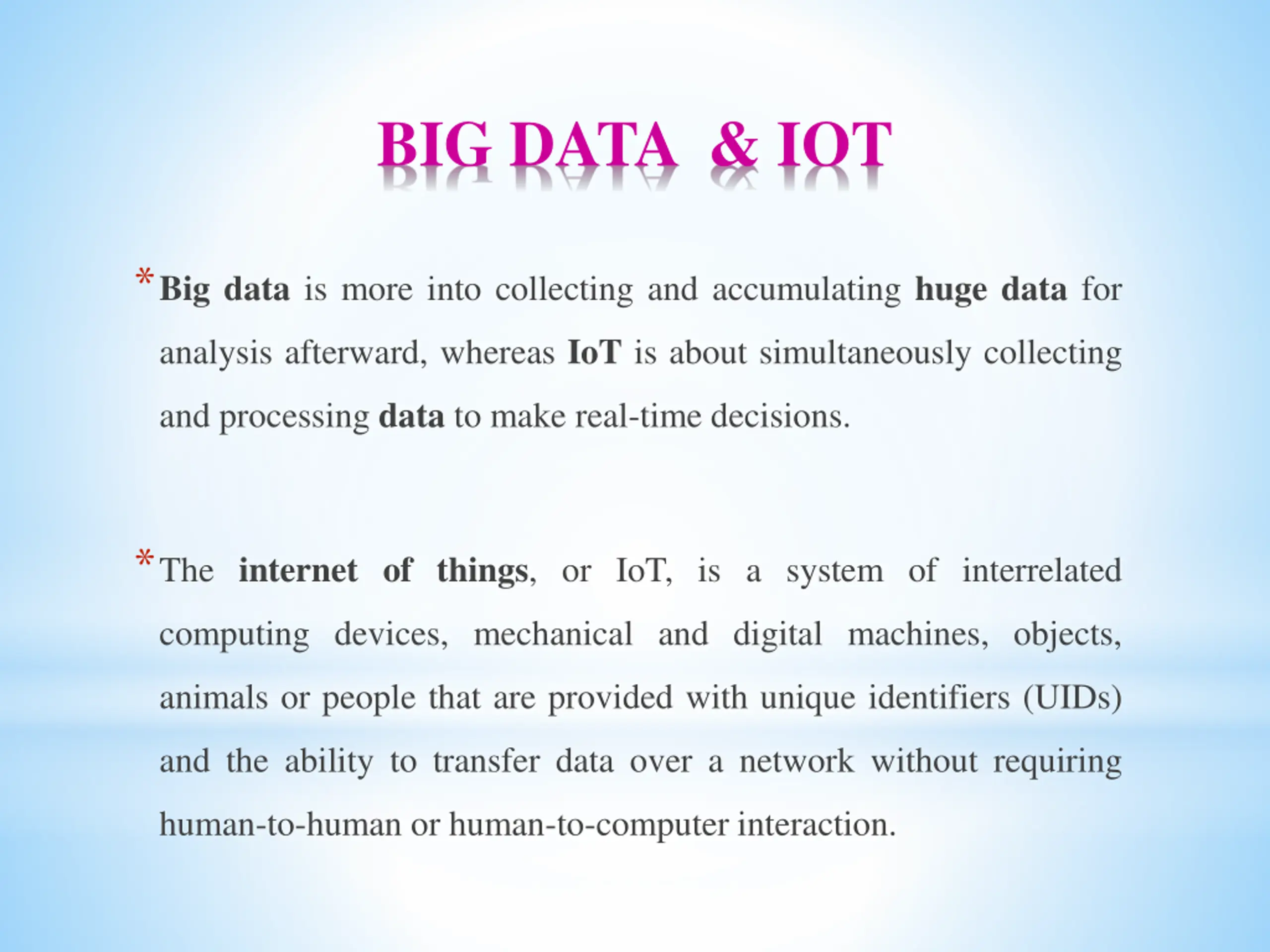 BIG DATA & IOT *Big data is more into collecting and accumulating huge data for analysis afterward, whereas IoT is about simultaneously collecting and processing data to make real-time decisions. *The internet of things, or IoT, is a system of interrelated computing devices, mechanical and digital machines, objects, animals or people that are provided with unique identifiers (UIDs) and the ability to transfer data over a network without requiring human-to-human or human-to-computer interaction.