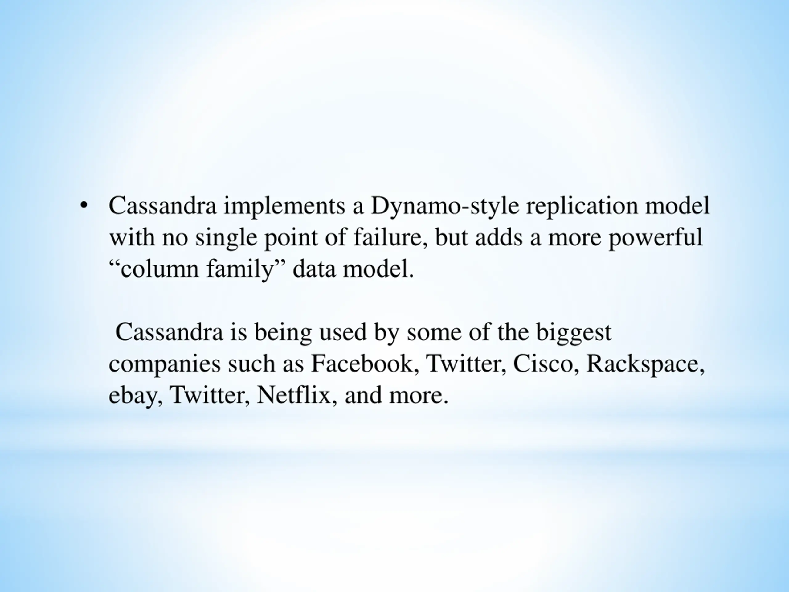 Cassandra implements a Dynamo-style replication model with no single point of failure, but adds a more powerful column family data model. Cassandra is being used by some of the biggest companies such as Facebook, Twitter, Cisco, Rackspace, ebay, Twitter, Netflix, and more.