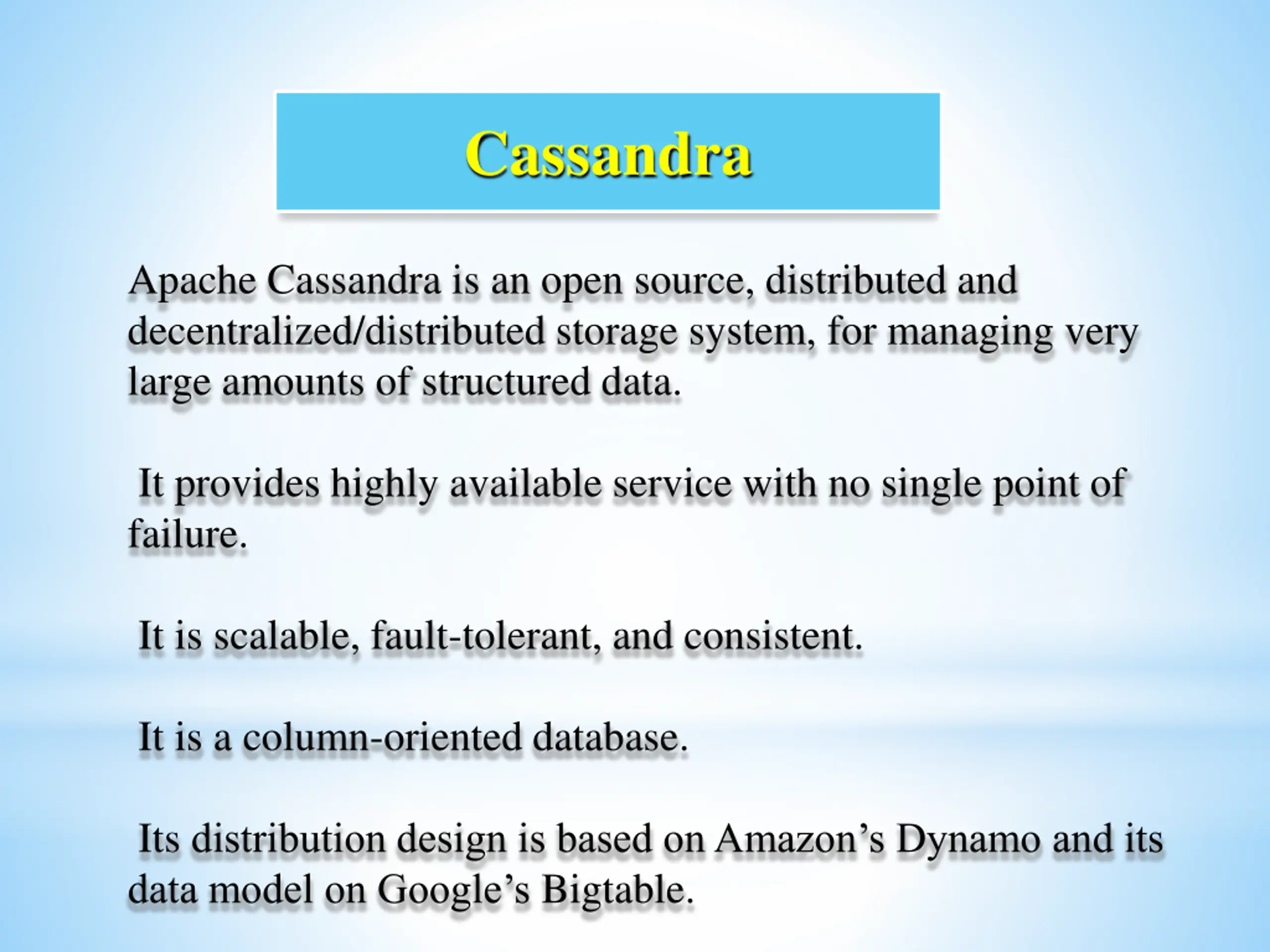 Cassandra Apache Cassandra is an open source, distributed and decentralized/distributed storage system, for managing very large amounts of structured data. It provides highly available service with no single point of failure. It is scalable, fault-tolerant, and consistent. It is a column-oriented database. Its distribution design is based on Amazon s Dynamo and its data model on Google s Bigtable.