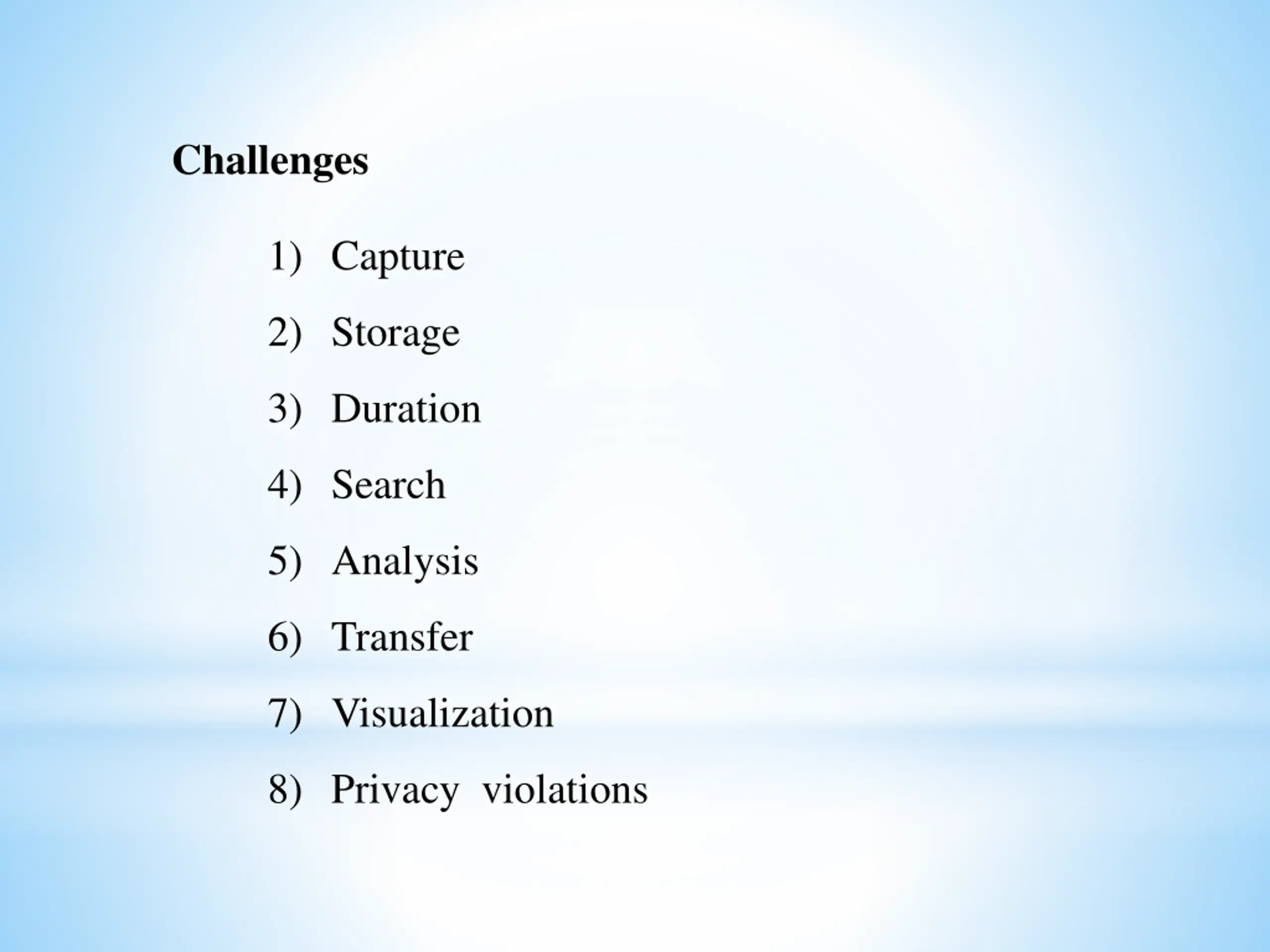 Challenges 1) Capture 2) Storage 3) Duration 4) Search 5) Analysis 6) Transfer 7) Visualization 8) Privacy violations