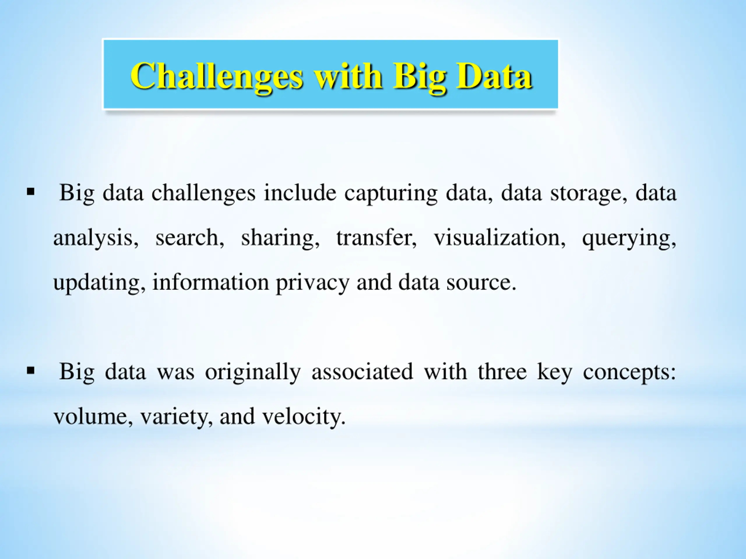 Challenges with Big Data Big data challenges include capturing data, data storage, data analysis, search, sharing, transfer, visualization, querying, updating, information privacy and data source. Big data was originally associated with three key concepts: volume, variety, and velocity.