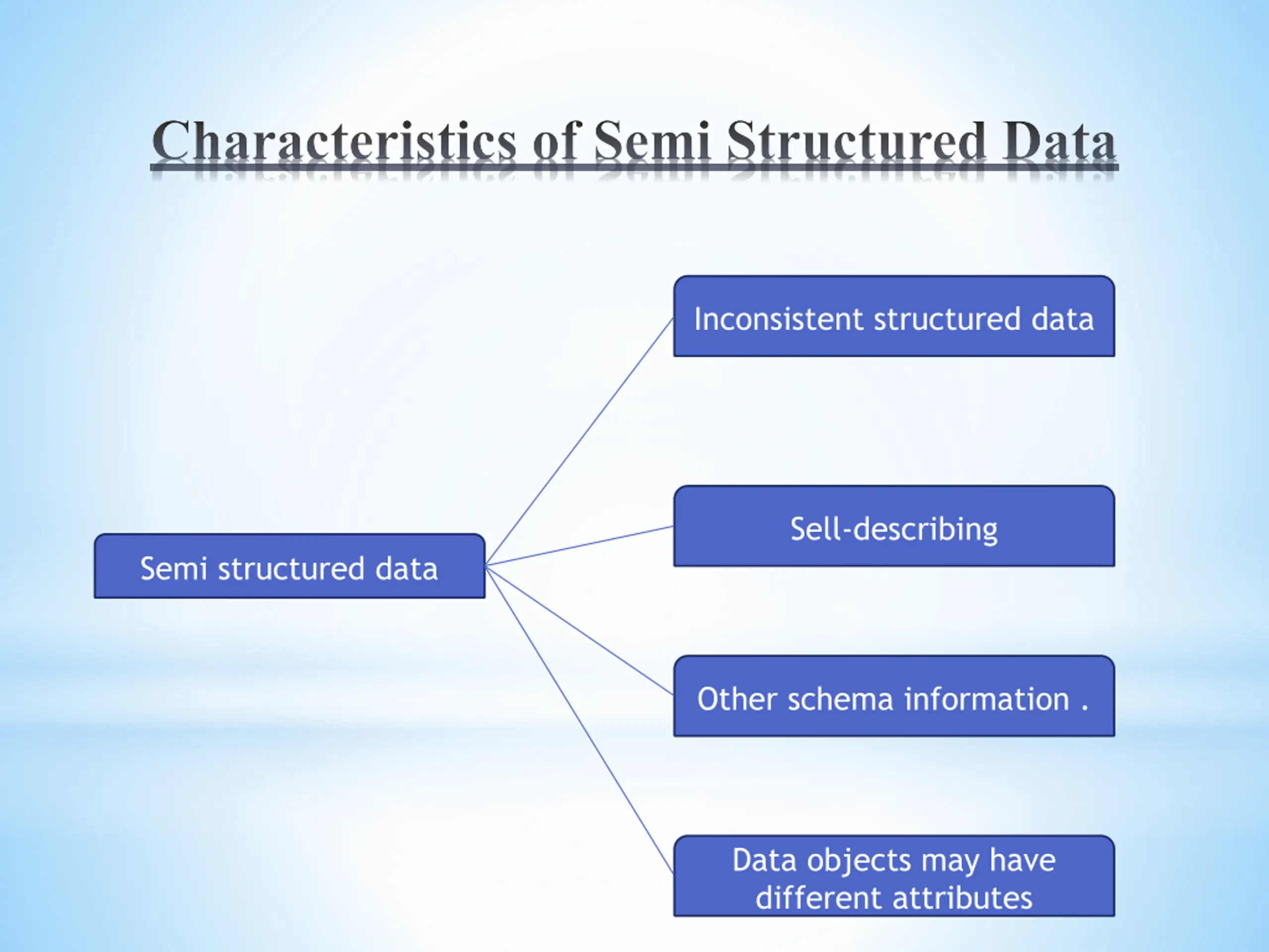Characteristics of Semi Structured Data Inconsistent structured data Sell-describing Semi structured data Other schema information . Data objects may have different attributes