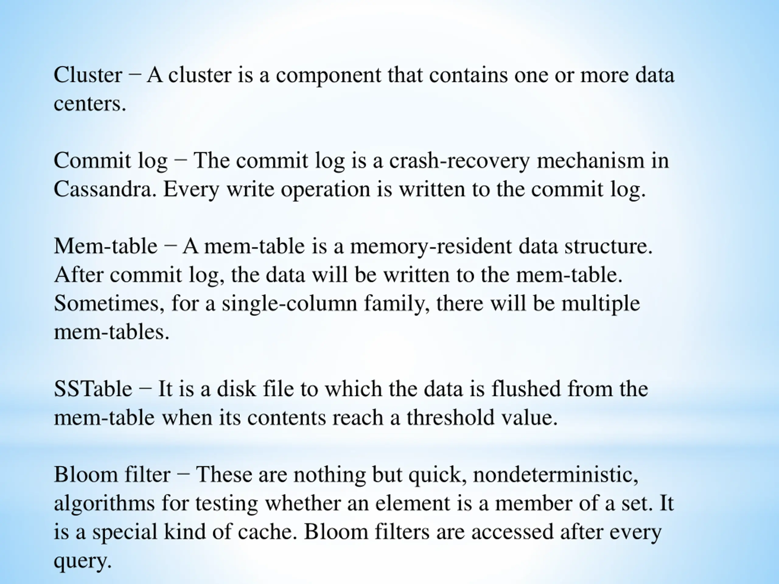Cluster A cluster is a component that contains one or more data centers. Commit log The commit log is a crash-recovery mechanism in Cassandra. Every write operation is written to the commit log. Mem-table A mem-table is a memory-resident data structure. After commit log, the data will be written to the mem-table. Sometimes, for a single-column family, there will be multiple mem-tables. SSTable It is a disk file to which the data is flushed from the mem-table when its contents reach a threshold value. Bloom filter These are nothing but quick, nondeterministic, algorithms for testing whether an element is a member of a set. It is a special kind of cache. Bloom filters are accessed after every query.