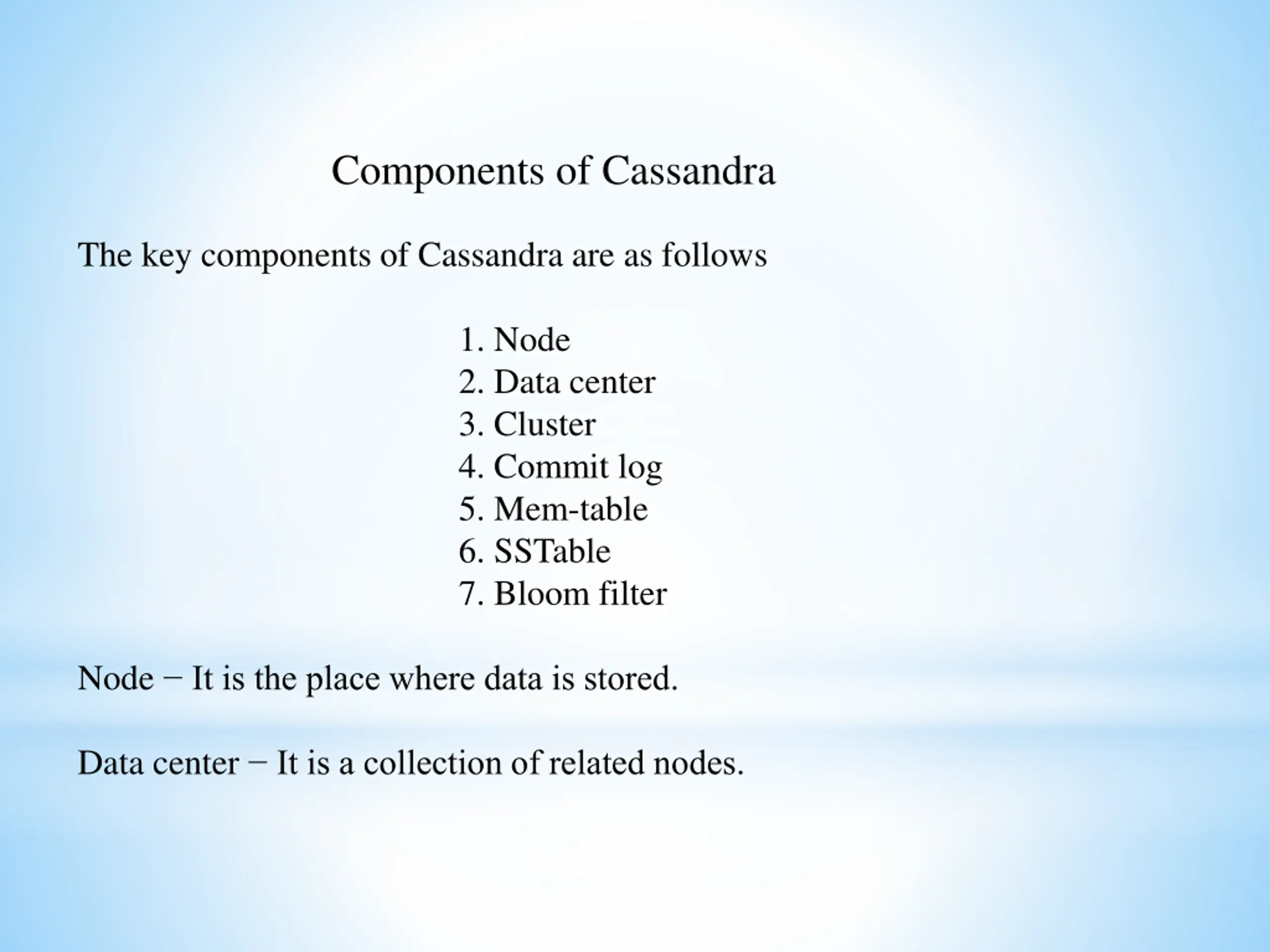 Components of Cassandra The key components of Cassandra are as follows 1. Node 2. Data center 3. Cluster 4. Commit log 5. Mem-table 6. SSTable 7. Bloom filter Node It is the place where data is stored. Data center It is a collection of related nodes.