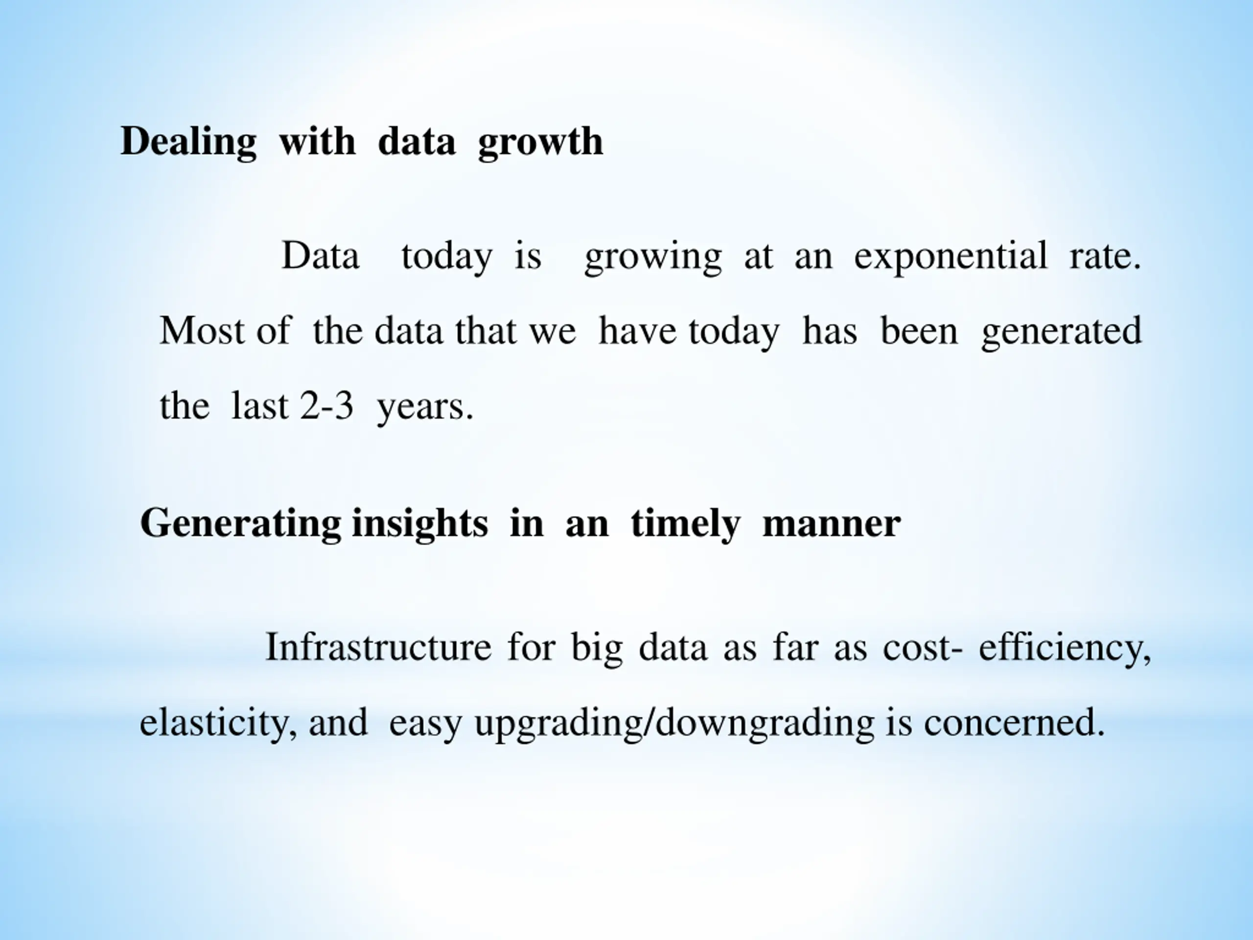 Dealing with data growth Data today is growing at an exponential rate. Most of the data that we have today has been generated the last 2-3 years. Generating insights in an timely manner Infrastructure for big data as far as cost- efficiency, elasticity, and easy upgrading/downgrading is concerned.
