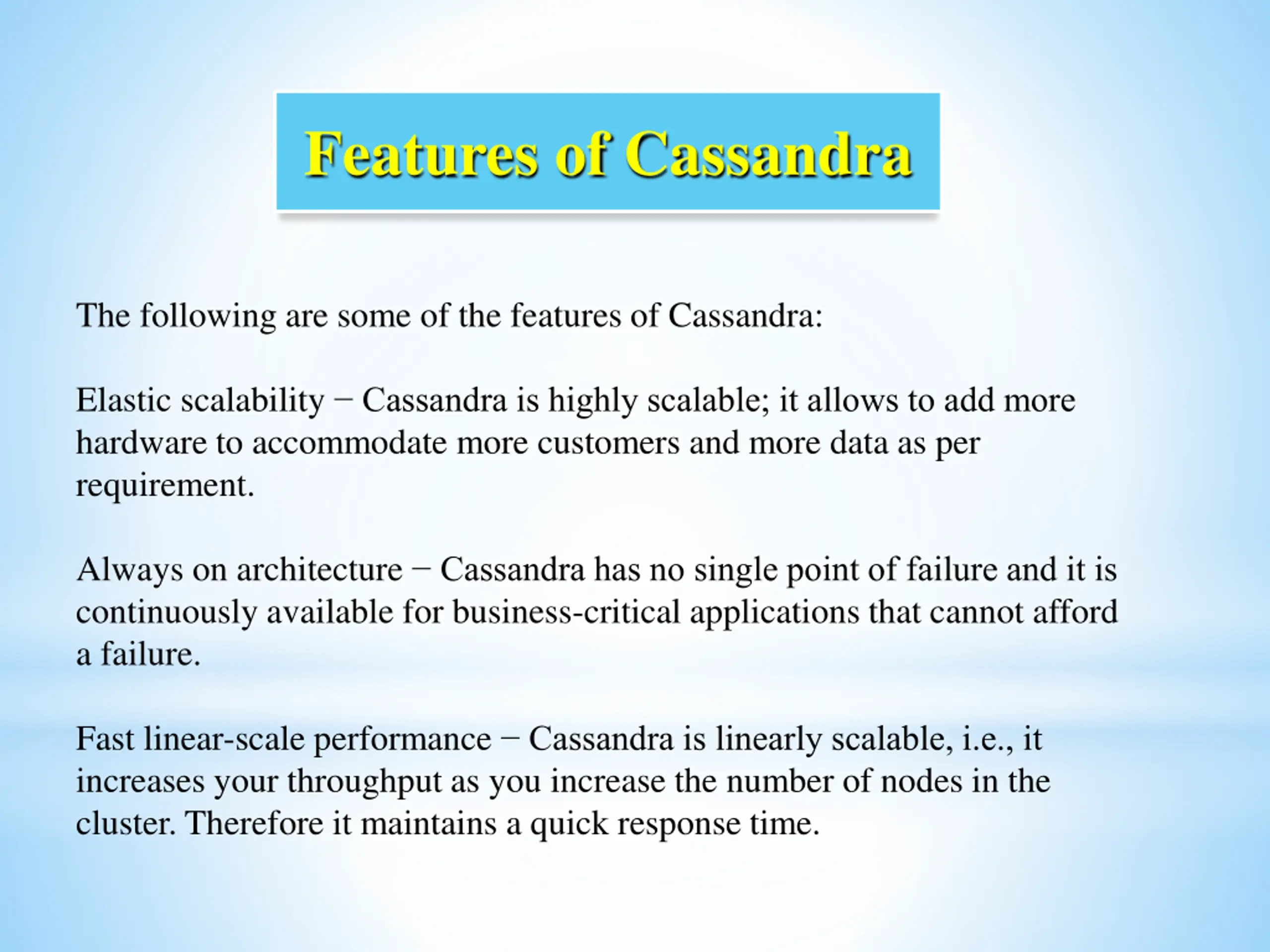 Features of Cassandra The following are some of the features of Cassandra: Elastic scalability Cassandra is highly scalable; it allows to add more hardware to accommodate more customers and more data as per requirement. Always on architecture Cassandra has no single point of failure and it is continuously available for business-critical applications that cannot afford a failure. Fast linear-scale performance Cassandra is linearly scalable, i.e., it increases your throughput as you increase the number of nodes in the cluster. Therefore it maintains a quick response time.