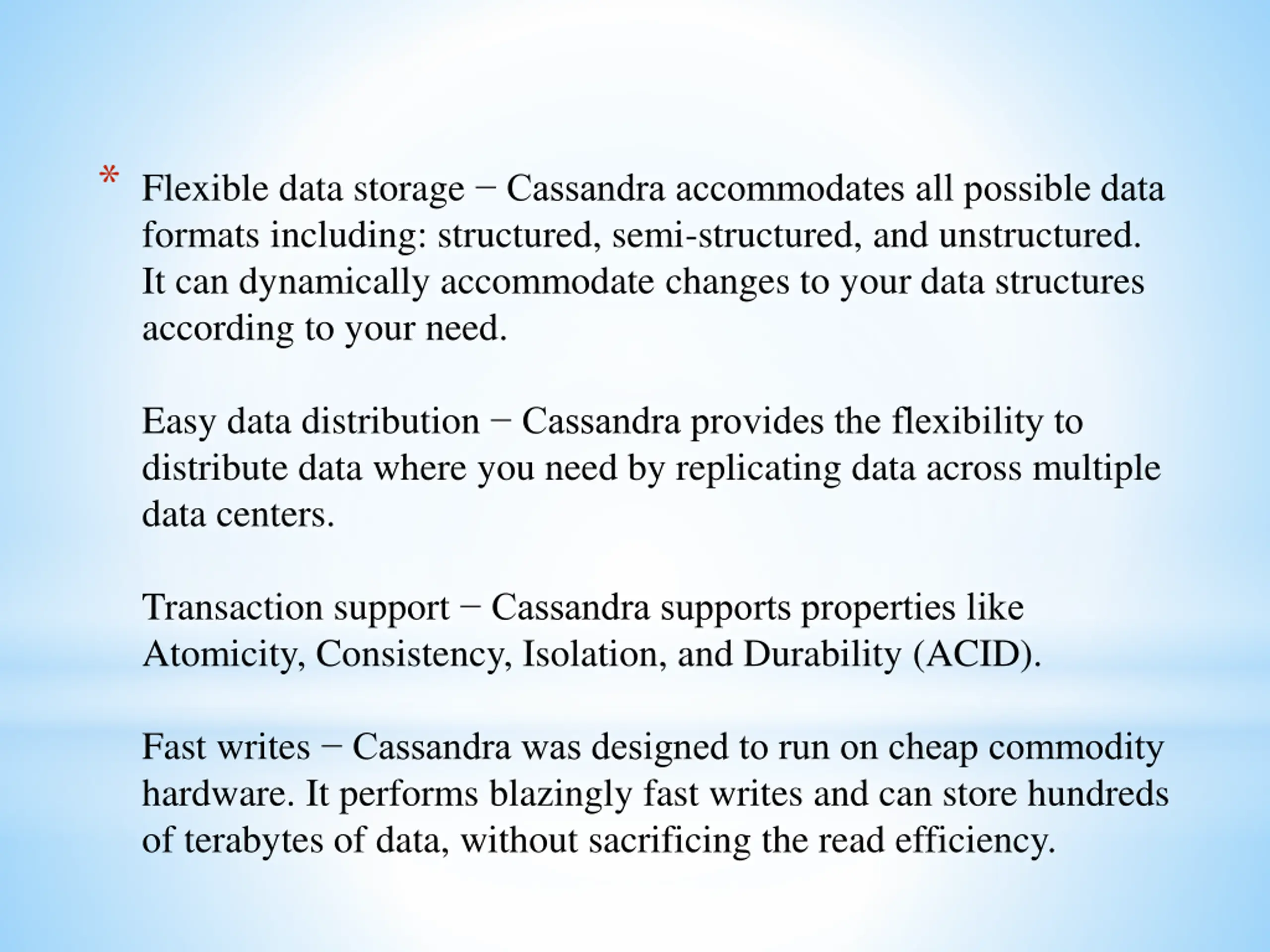 * Flexible data storage Cassandra accommodates all possible data formats including: structured, semi-structured, and unstructured. It can dynamically accommodate changes to your data structures according to your need. Easy data distribution Cassandra provides the flexibility to distribute data where you need by replicating data across multiple data centers. Transaction support Cassandra supports properties like Atomicity, Consistency, Isolation, and Durability (ACID). Fast writes Cassandra was designed to run on cheap commodity hardware. It performs blazingly fast writes and can store hundreds of terabytes of data, without sacrificing the read efficiency.