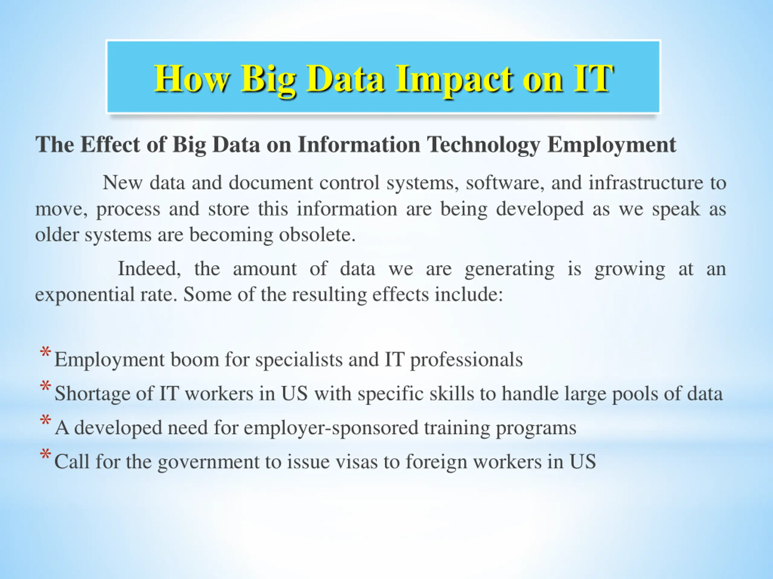 How Big Data Impact on IT The Effect of Big Data on Information Technology Employment New data and document control systems, software, and infrastructure to move, process and store this information are being developed as we speak as older systems are becoming obsolete. Indeed, the amount of data we are generating is growing at an exponential rate. Some of the resulting effects include: *Employment boom for specialists and IT professionals *Shortage of IT workers in US with specific skills to handle large pools of data *A developed need for employer-sponsored training programs *Call for the government to issue visas to foreign workers in US
