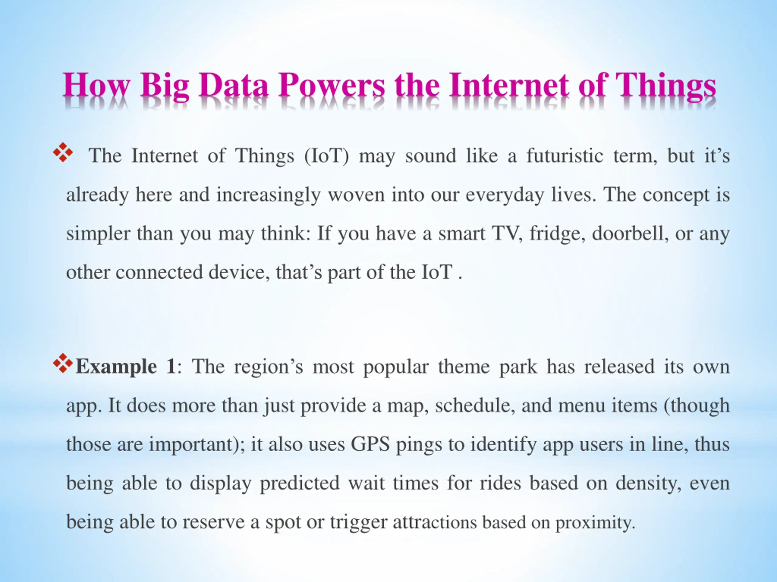 How Big Data Powers the Internet of Things The Internet of Things (IoT) may sound like a futuristic term, but it s already here and increasingly woven into our everyday lives. The concept is simpler than you may think: If you have a smart TV, fridge, doorbell, or any other connected device, that s part of the IoT . Example 1: The region s most popular theme park has released its own app. It does more than just provide a map, schedule, and menu items (though those are important); it also uses GPS pings to identify app users in line, thus being able to display predicted wait times for rides based on density, even being able to reserve a spot or trigger attractions based on proximity.