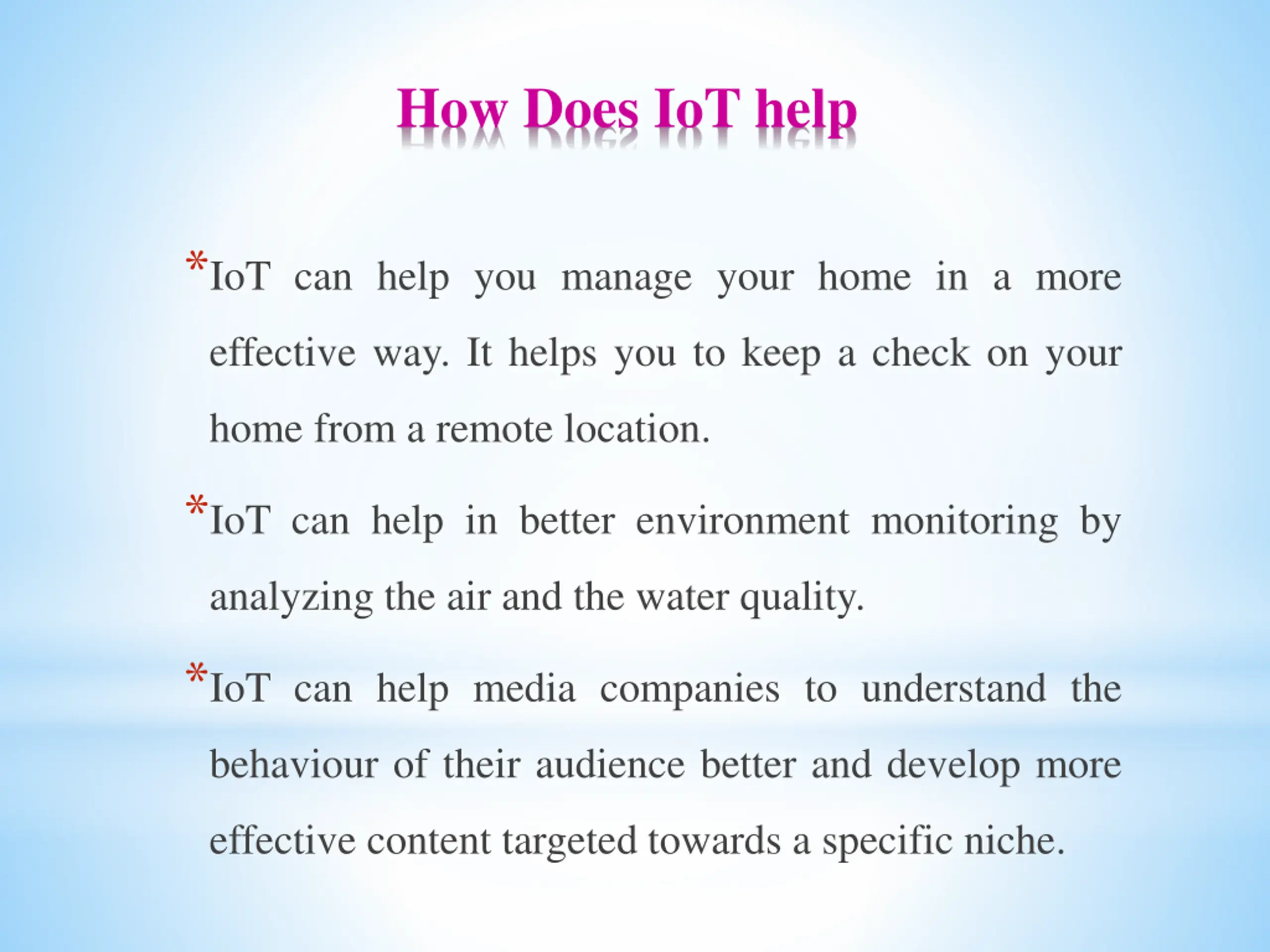 How Does IoT help *IoT can help you manage your home in a more effective way. It helps you to keep a check on your home from a remote location. *IoT can help in better environment monitoring by analyzing the air and the water quality. *IoT can help media companies to understand the behaviour of their audience better and develop more effective content targeted towards a specific niche.