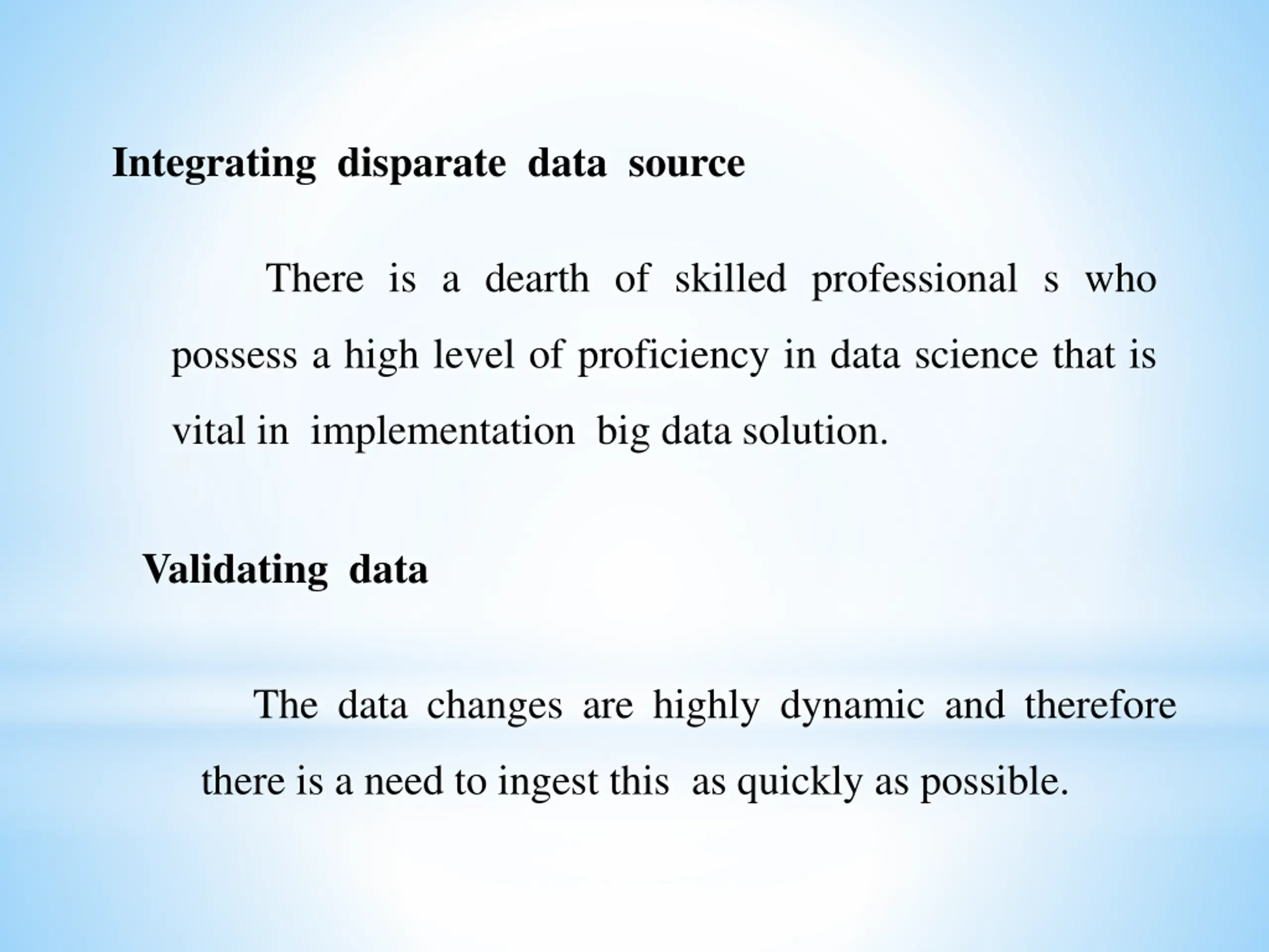 Integrating disparate data source There is a dearth of skilled professional s who possess a high level of proficiency in data science that is vital in implementation big data solution. Validating data The data changes are highly dynamic and therefore there is a need to ingest this as quickly as possible.