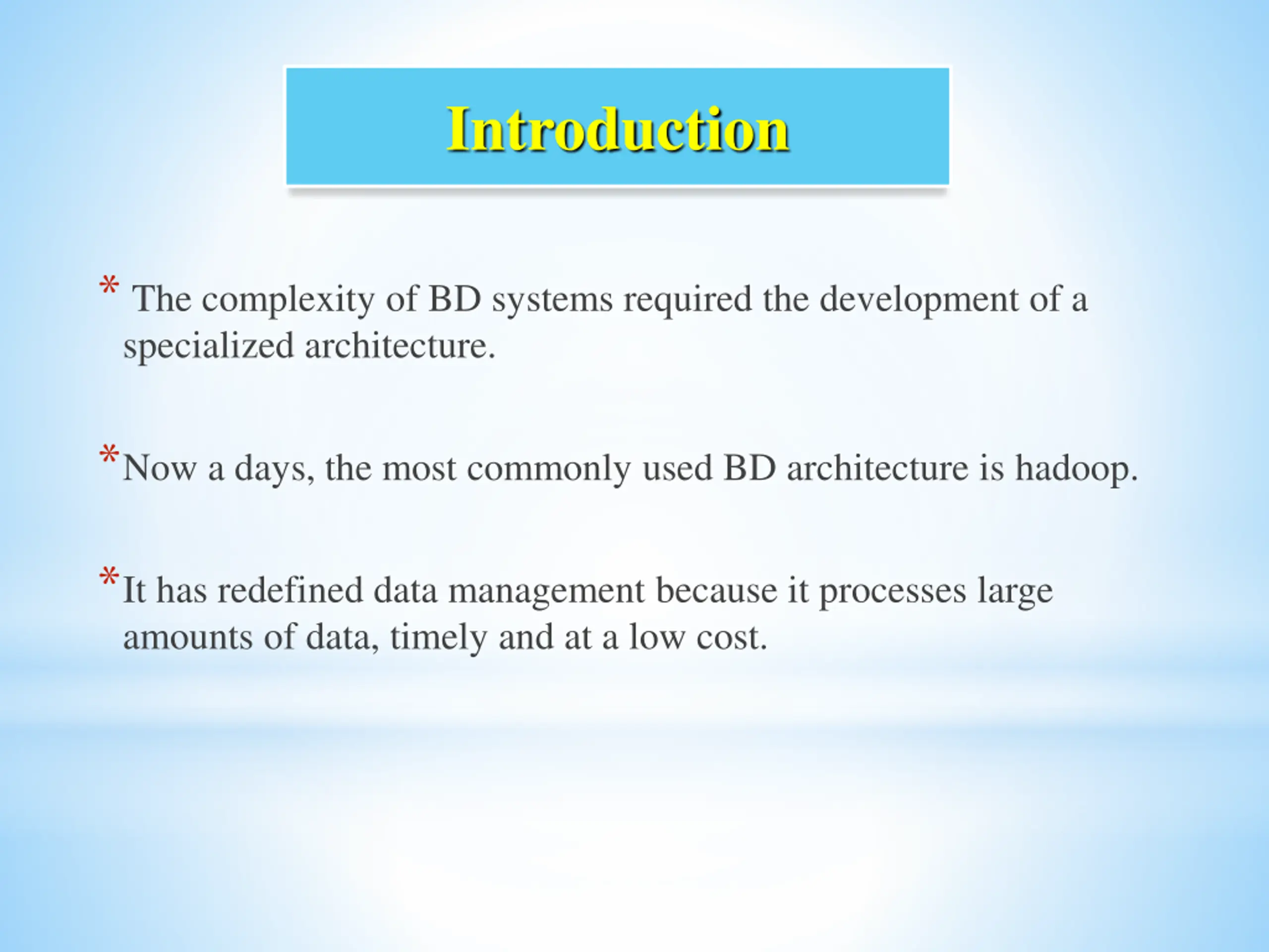 Introduction * The complexity of BD systems required the development of a specialized architecture. *Now a days, the most commonly used BD architecture is hadoop. *It has redefined data management because it processes large amounts of data, timely and at a low cost.