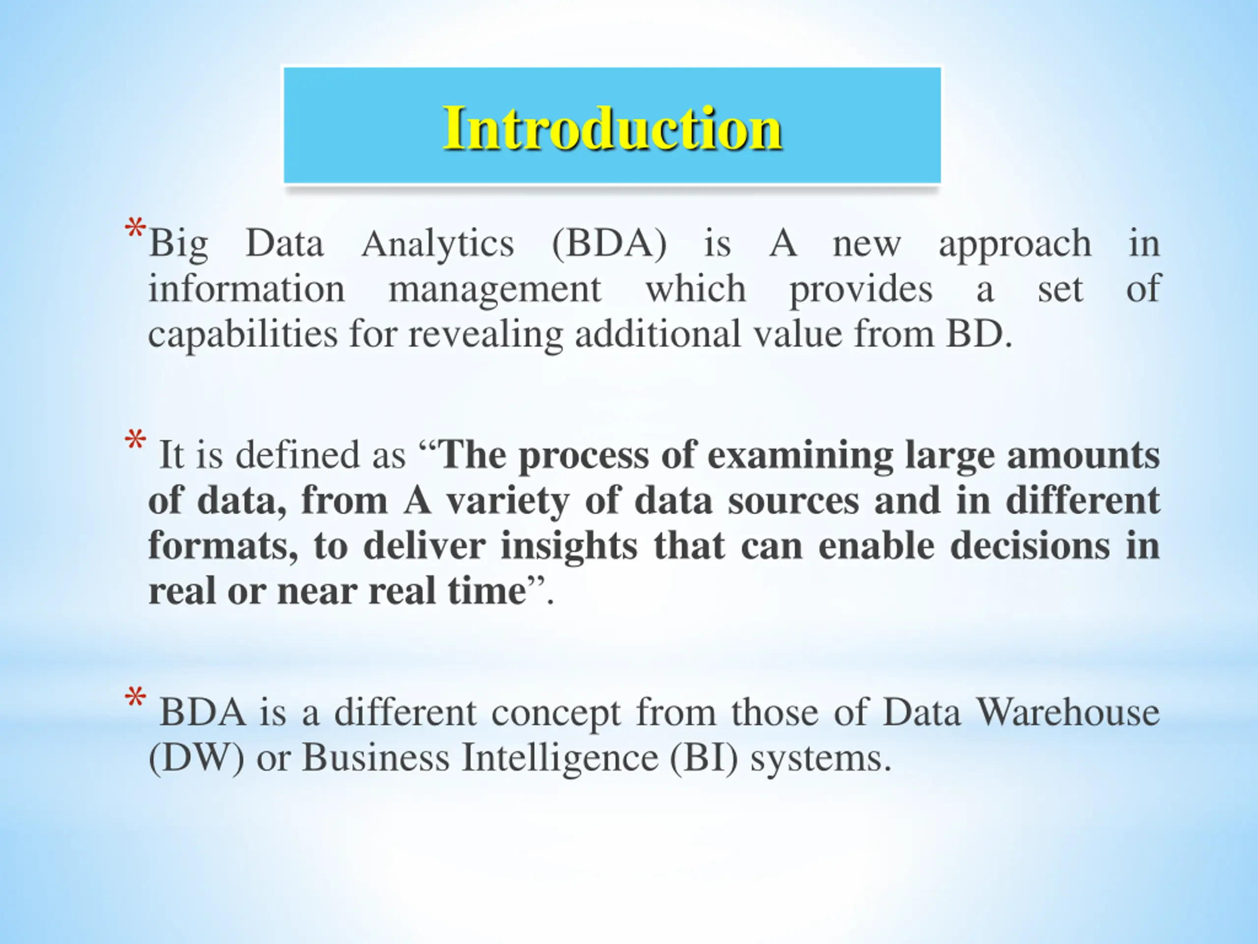 Introduction *Big Data Analytics (BDA) is A new approach in information management which provides a set of capabilities for revealing additional value from BD. * It is defined as The process of examining large amounts of data, from A variety of data sources and in different formats, to deliver insights that can enable decisions in real or near real time . * BDA is a different concept from those of Data Warehouse (DW) or Business Intelligence (BI) systems.