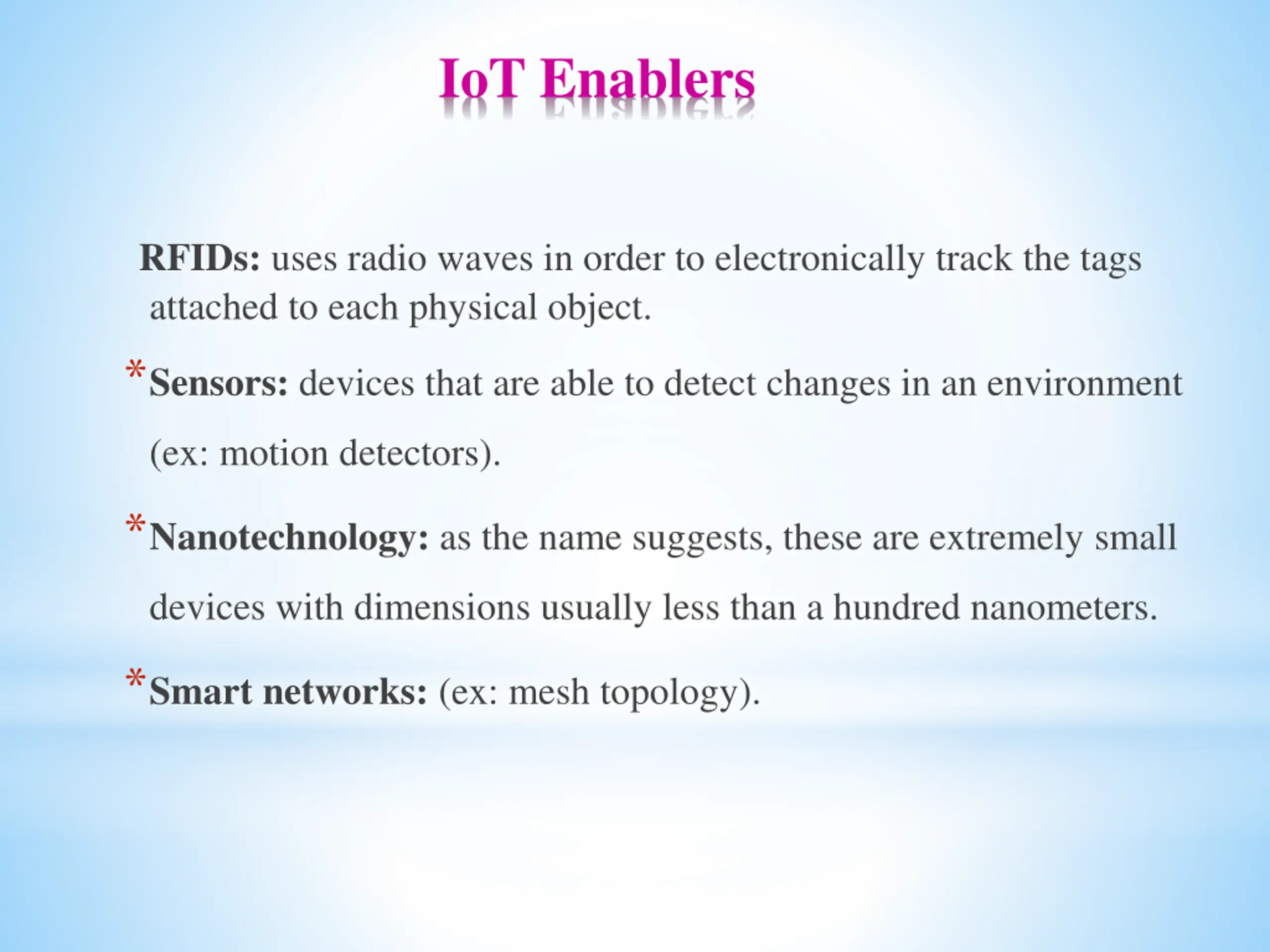 IoT Enablers RFIDs: uses radio waves in order to electronically track the tags attached to each physical object. *Sensors: devices that are able to detect changes in an environment (ex: motion detectors). *Nanotechnology: as the name suggests, these are extremely small devices with dimensions usually less than a hundred nanometers. *Smart networks: (ex: mesh topology).