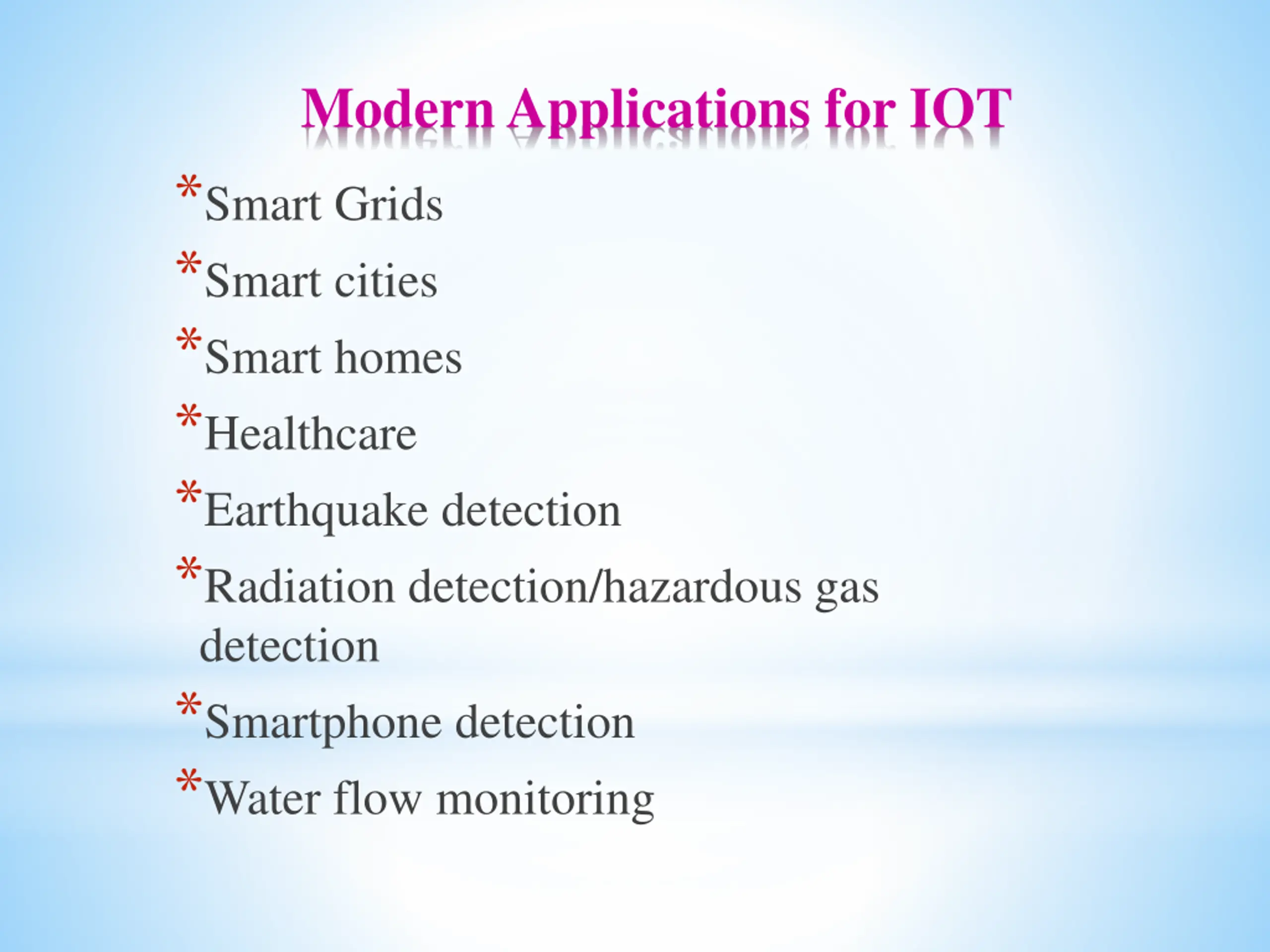 Modern Applications for IOT *Smart Grids *Smart cities *Smart homes *Healthcare *Earthquake detection *Radiation detection/hazardous gas detection *Smartphone detection *Water flow monitoring